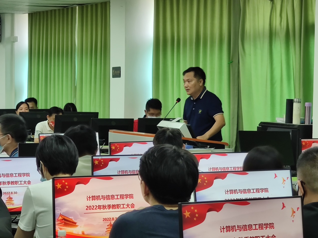 为了新学期的工作能顺利有序的开展,计算机与信息工程学院于2022年8月30日下午在天河校区实训楼403室召开了新学期第一次全体教职工大会,学院领导班子及全体教职工参加了会议。