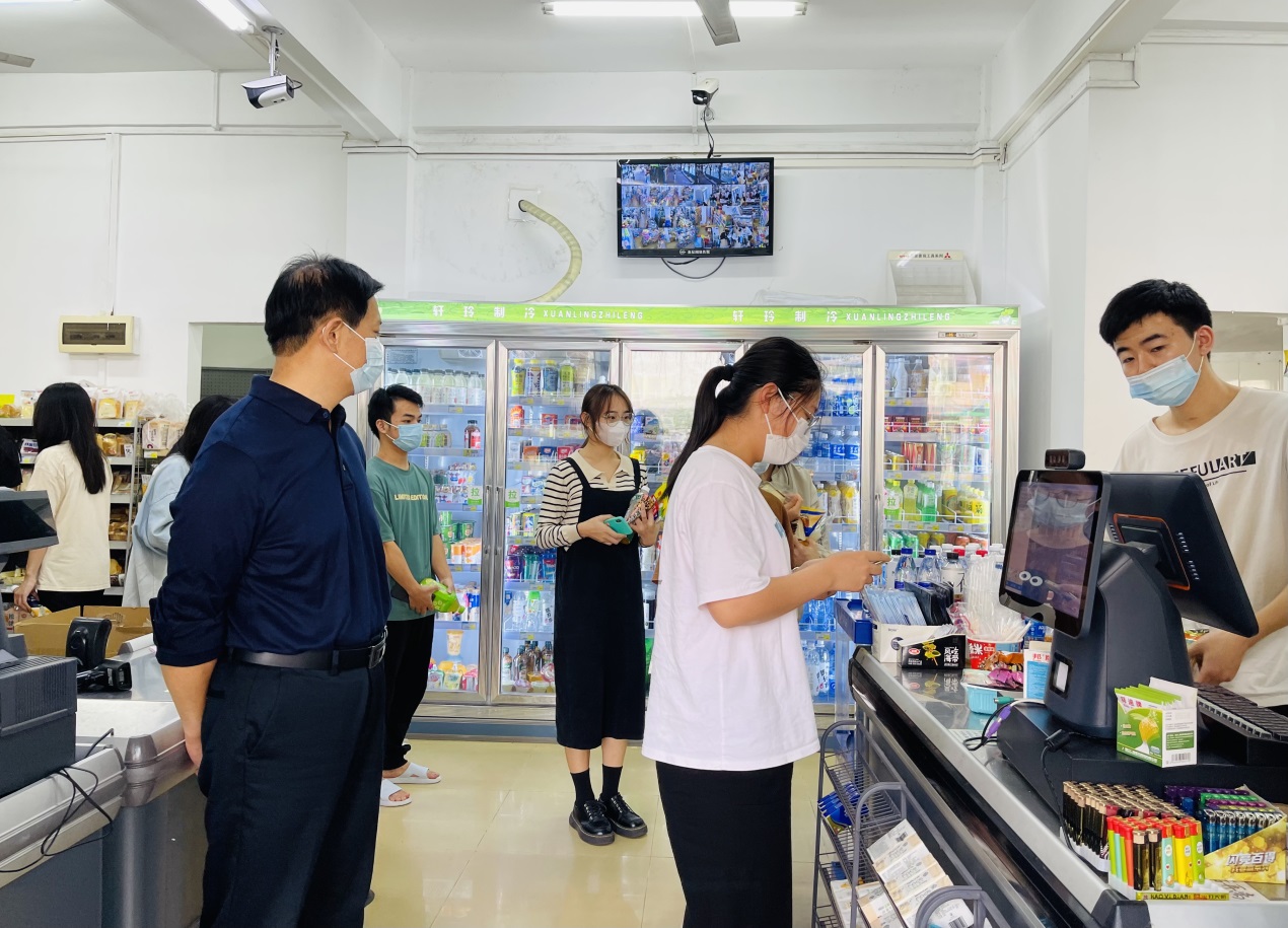 何校长一行首先检查了西区的健康观察房,随后来到了天河东区门岗,和值班的保安人员了解了出入门口的管控情况以及临时快递存放点的消毒工作。紧接着,何校长偕同各部门查看了实训楼、教学楼、篮球场核酸监测点、校园小超市等场所,了解学生在校园的学习生活情况,以及各项工作是否严格执行了疫情防控的相关规定。