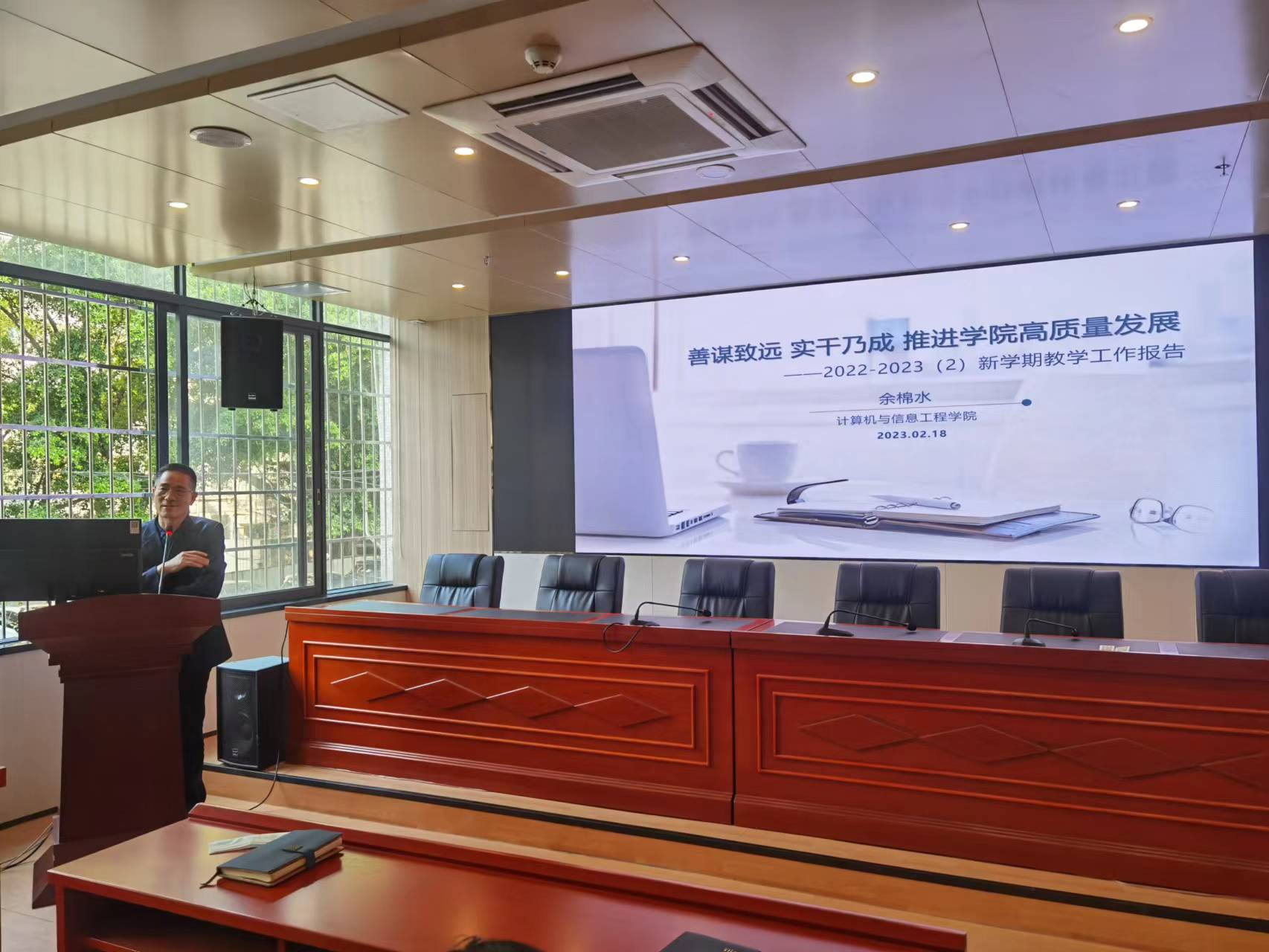 2023年2月18日下午,计算机与信息工程学院在东区报告厅召开了新学期第一次全院教职工大会。计算机学院院长余棉水,党总支副书记张艳、副院长单家凌、副院长鲁庆,及全体教职工参加了会议。会议由学工处主任代启兵主持。