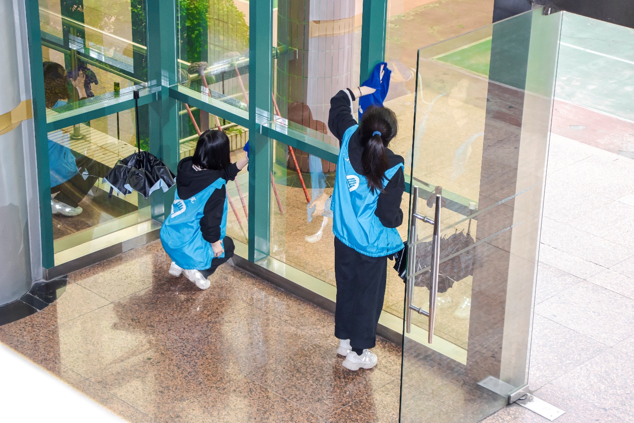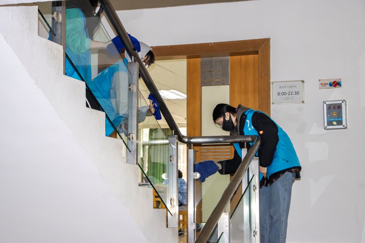 志愿者正在擦拭楼梯护栏以及玻璃