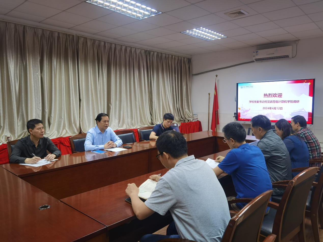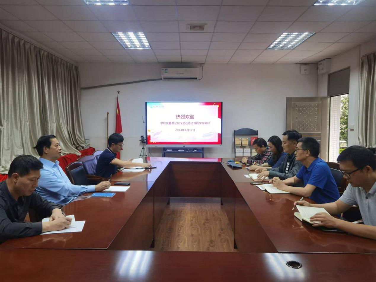 4月12日,学校党委书记何汉武赴计算机与信息工程学院调研指导工作,并与学院领导班子座谈交流。学校办公室主任吴浩、学生工作部部长刘建军参加调研。