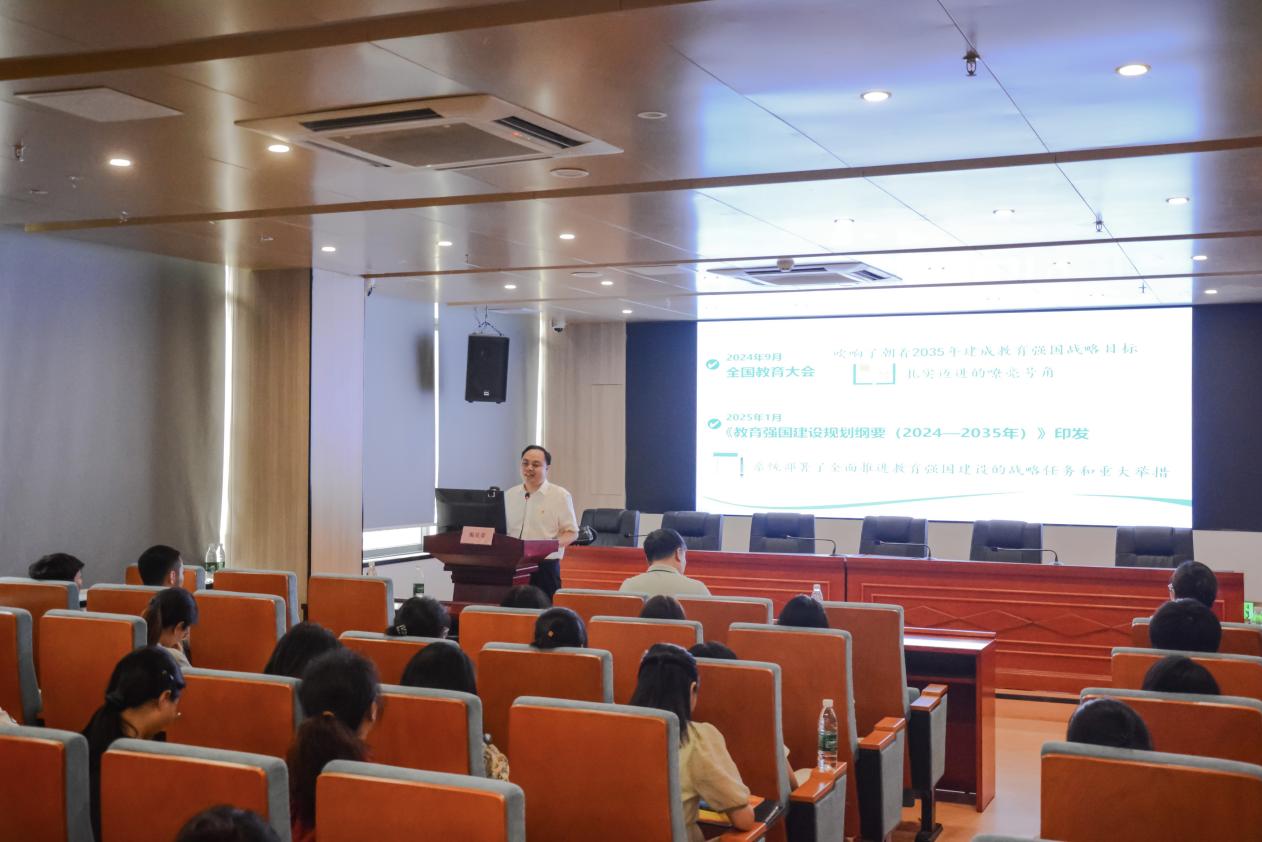 课上,揭英荣分析我国离教育强国尚存差距,并阐述了推进教育强国建设的五大战略任务。立德树人固根本,用党的创新理论铸魂育人,培养德智体美劳全面发展的社会主义建设者和接班人;科创支撑强动能,要优化学科布局,加强基础学科、新兴交叉学科建设,深化产教融合、科教融汇,发挥高校基础研究主力军作用,打造重大科技突破策源地;服务提质促公平,需持续优化资源配置,推进义务教育优质均衡,巩固“双减”成果,深入实施教育数字化战略;强师兴教筑根基,要大力弘扬教育家精神,建设高素质专业化教师队伍;全球引领拓格局,建设具有全球影响力的重要教育中心是方向,需深化高水平教育对外开放,深度参与全球教育治理。
