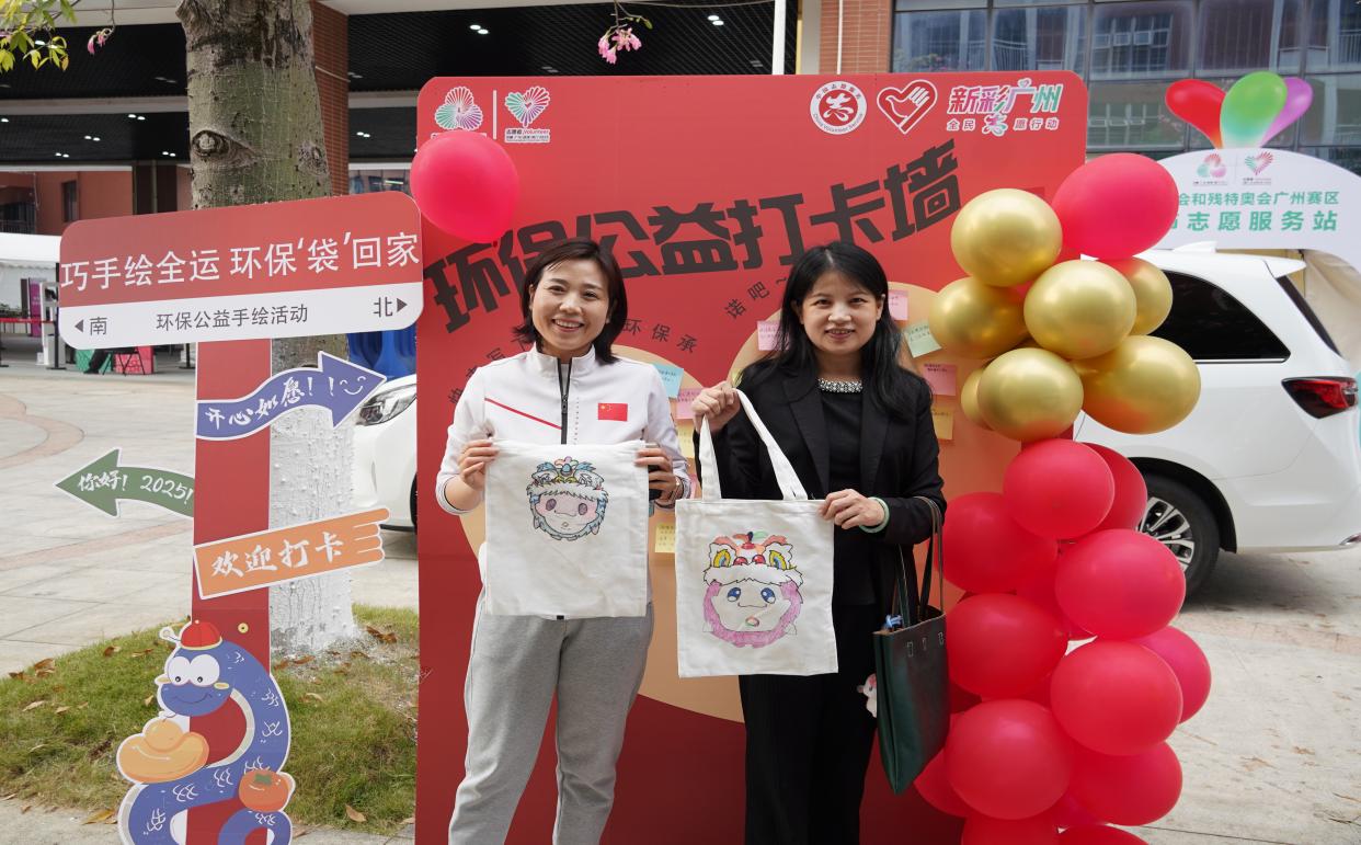 志愿者们准备了洁白的环保袋与五彩斑斓的颜料,邀请市民共同参与创作。大家以笔为媒,将十五运会与残特奥会吉祥物“喜洋洋”“乐融融”的形象绘制在环保袋上。通过手绘的方式,将体育文化与环保实践相结合,不仅让吉祥物形象更加贴近生活,也将“少用塑料袋、践行低碳生活”的环保理念深入人心。