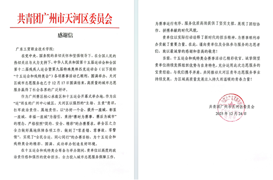 感谢信中指出,学校以实际行动诠释了新时代的担当精神,为赛事顺利举办贡献了重要力量。当前,十五运会和残特奥会已精彩收官,共青团天河区委诚挚期望学校持续发挥组织优势与自身特色,转化运用此次志愿服务的宝贵经验,携手推动天河区青年志愿服务事业持续发展,为区域高质量发展注入持久温暖的青春力量。