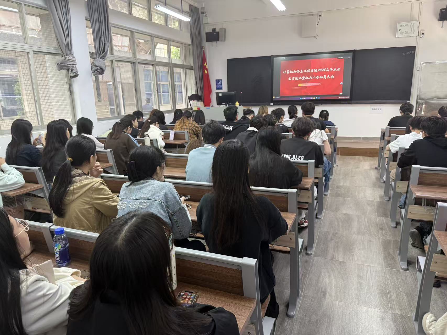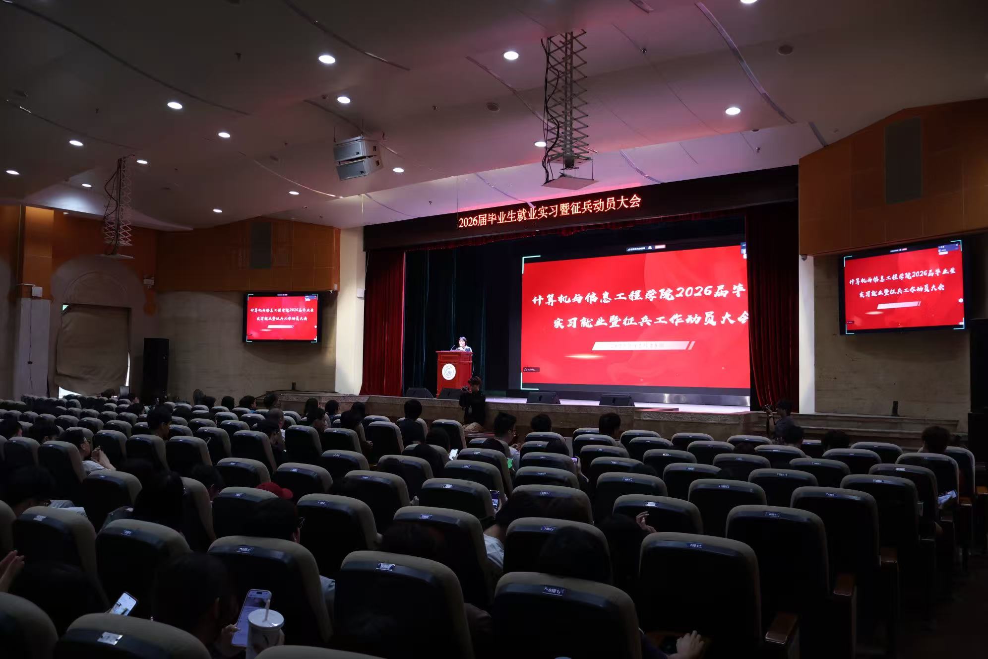 为全面推进2026届毕业生的就业实习与征兵工作,贯彻落实学校高质量就业的要求,引导学生树立正确的就业观和报国志向,计算机学院近日在学院礼堂、报告厅、教室,采用主副会场的形式,举办了2026届毕业生就业实习暨征兵动员大会。学院党总支书记张宁、党总支副书记张艳、副院长周宇、辅导员以及818名2026届毕业生参加了此次会议,会议由杨霞主持。