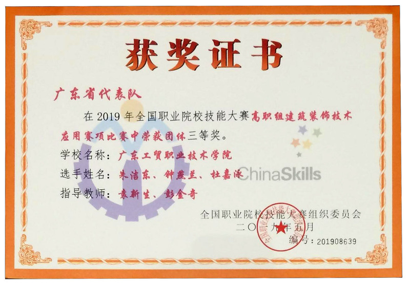 新葡的京集团8814(中国)股份公司首次组织参加该赛项,机电学院游凯副院长作为领队,袁新生、彭金奇老师作为指导老师,朱洁东、钟燕兰、杜嘉泳三名同学作为队员;选手和老师们在获得2019年广东省职业院校技能大赛“建筑装饰技术应用(高职组)”省赛一等奖取得该赛项的国赛资格基础上积极训练,努力备战,最终在国赛的赛场上,获全国赛的“三等奖”,实现了技能大赛该项目省赛、国赛的突破。