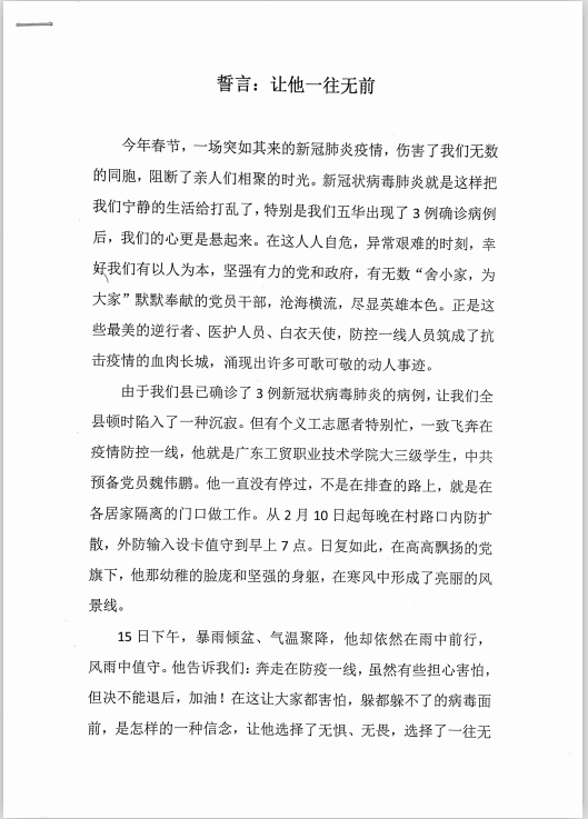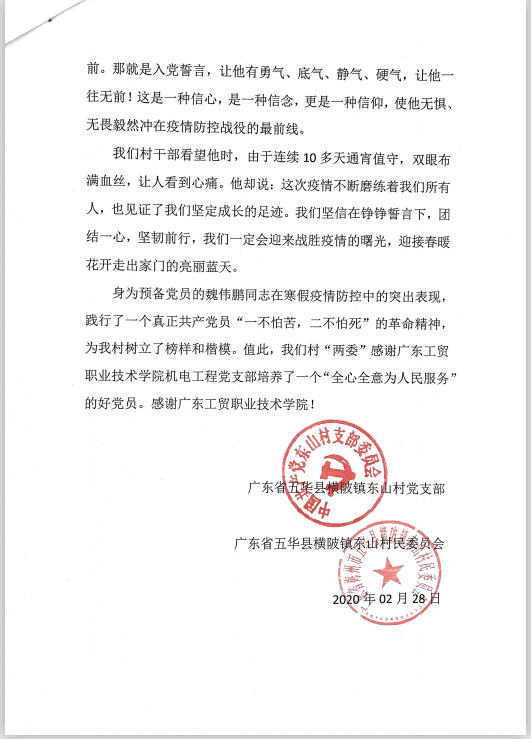 魏伟鹏,新葡的京集团8814vip机电工程学院学生第一党支部预备党员。在家乡五华县横陂镇东山村抗击新型冠状病毒肺炎疫情严峻态势下,该同志闻令而动、冲锋在前,入户登记排查、站点值班值守、测温控制人流、协调人员出入,以最坚定的意志、最顽强的作风,做好疫情防控的每一项工作,为坚决遏制疫情扩散蔓延势头、守护好人民群众生命健康,做了大量艰苦工作,付出了巨大努力。