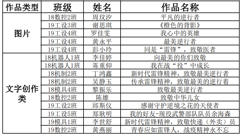 本次“传承雷锋精神,致敬最美逆行者”文化创作活动,在机电工程学院全体师生的共同努力下,取得了优异的成效。我们收到了来自19个班的31个作品,作品提交类型有:海报、图片、文字创作。其中优秀作品获得者情况如下: