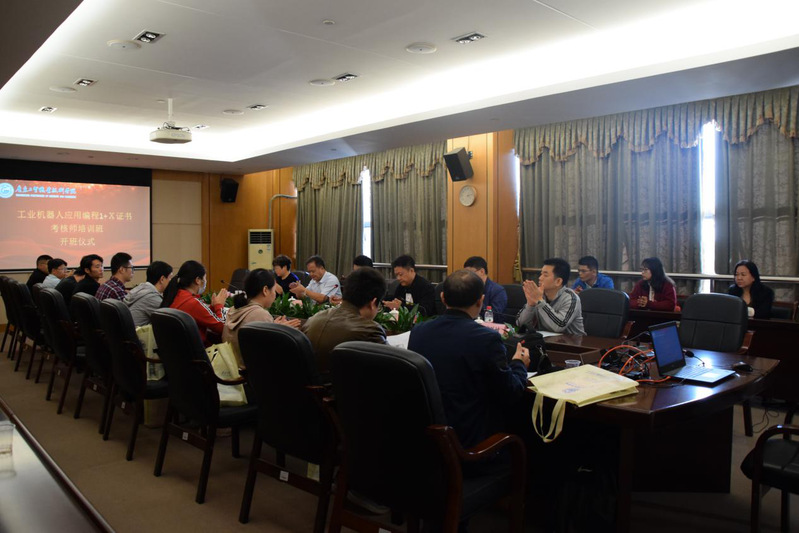 11月27日在新葡的京官网白云校区举行了开班仪式,学校副校长唐毓秋、继续教育院长朱永平、机电学院领导班子邵超城、徐勇军、游凯、北京赛育达公司马雪峰教授、校外专家莫胜撼教授及各位参培学员参与了开班仪式。会上唐校长肯定了新葡的京官网的培训工作,也对此次承担着组织评价机构与广东省16所院校“工业机器人应用编程”1+X技能等级证书试点院校的沟通和管理工作进行了合理安排,并对下一步新葡的京官网积极组织“工业机器人应用编程”1+X技能等级证书师,资培训班、学生培训与考证工作进行了部署,赛育达公司马雪峰教授随后也做了重要发言和培训的相关安排,学员代表宋显文老师也代表43位参训老师做了发言。