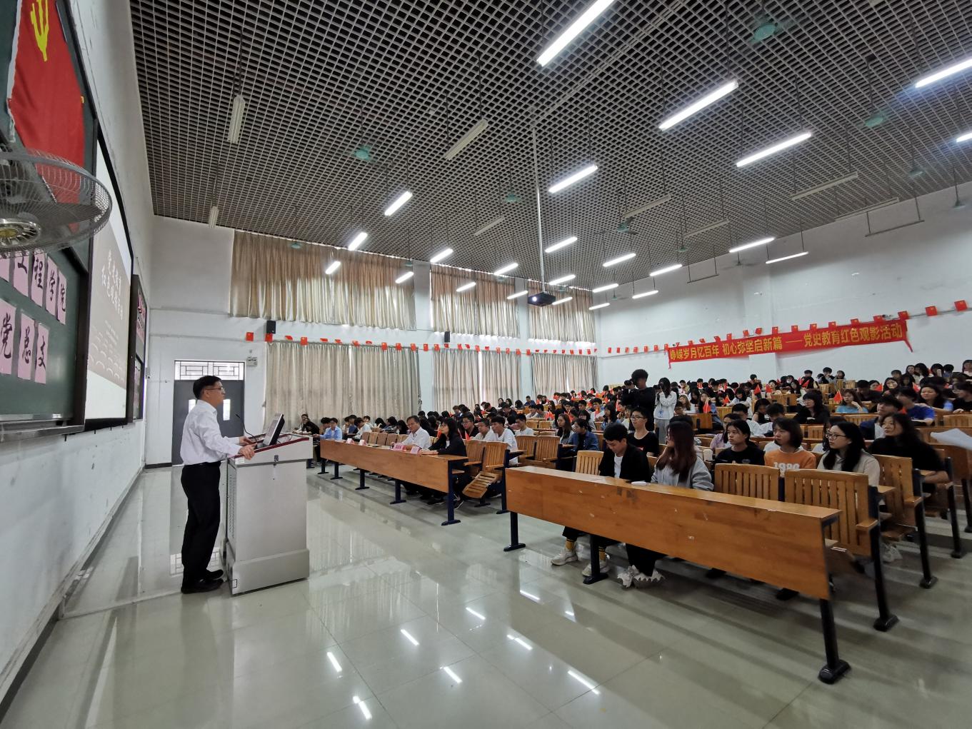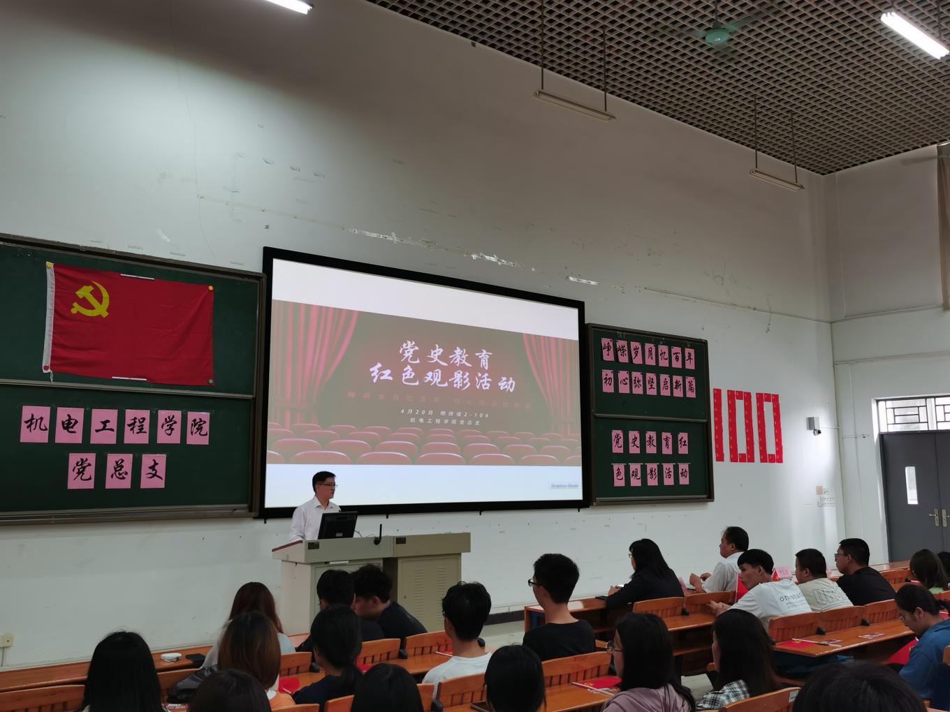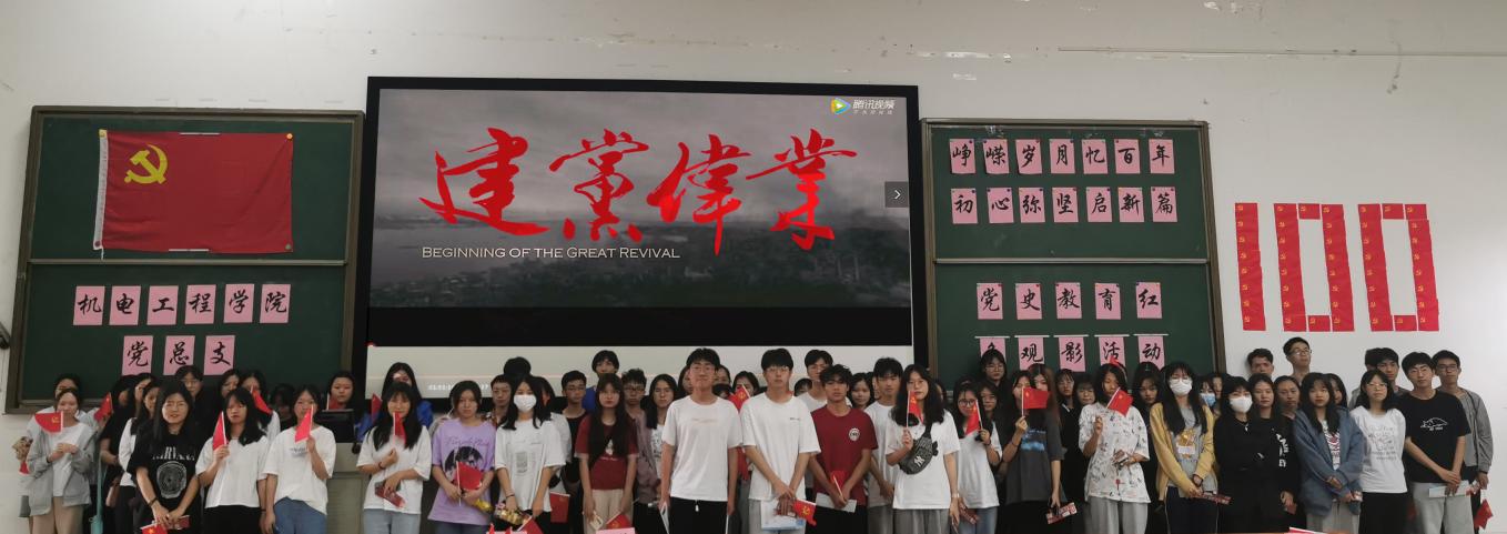 会上,邵超城介绍此次活动的安排,并表明本次活动,全校学生观看以红色革命或改革开放题材的影视作品,在回顾党的光辉历程的同时,深化革命传统教育,激发爱国主义热情。刘贻新则以“中科院博士论文《致谢》走红”引入,勉励师生,奋斗永远是青春靓丽的底色。其表示,在建党100周年波澜壮阔的历史进程中,中国共产党之所以能够成为世界第一大执政党,是无数先烈为之奋斗的结果,是数万人共同的信仰,它创造了人类社会发展史上惊天动地的奇迹,机电工程学院党总支能够把优秀的电影作品作为党史学习教育的生动教材,引导学生加深对党的历史理解和把握,切身感受艰辛历程、巨大变化、辉煌成就,厚植爱党、爱国、爱社会主义的情感,让广大青年学生从观影中“学史明理、学史增信、学史崇德、学史力行”。随后,宣布活动开幕,并一同观看红色经典电影《建党伟业》。