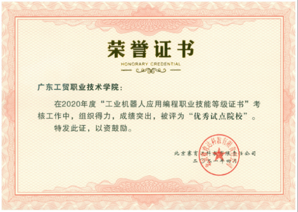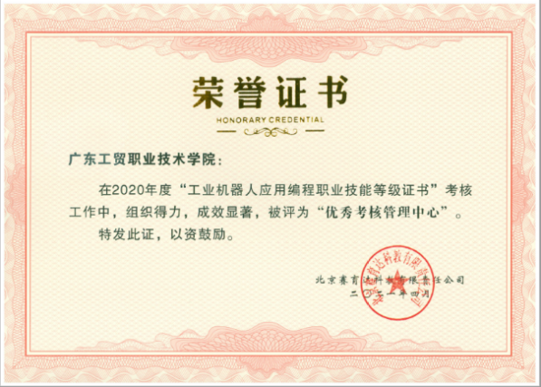 在推进1+X证书制度试点任务过程中,新葡的京官网去年以广东省管理中心为任,积极完成本校的培训考核任务,并积极联系其他兄弟院校组织培训和考核,去年年底共考核考生900人次。赛育达公司在推荐遴选、综合考察的基础上,新葡的京官网被评为2020年度工业机器人应用编程1+X证书制度试点工作优秀考核管理中心和优秀试点院校,机电工程学院邵超城被评为突出贡献专家、周佳杰被评为先进工作者、孙涛、王锐斌等被评为优秀考核师。