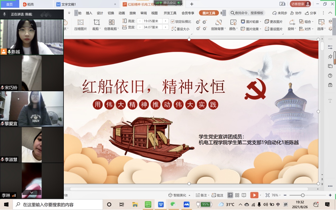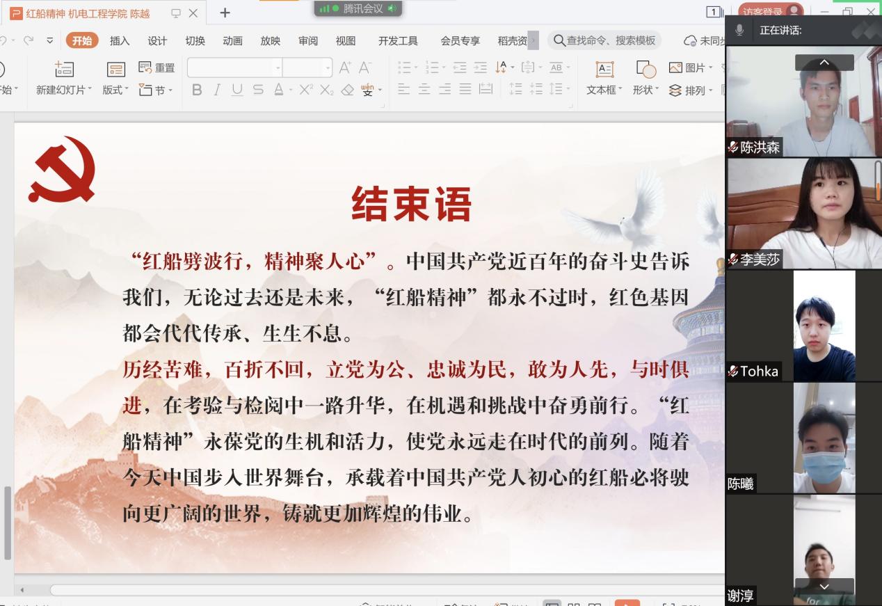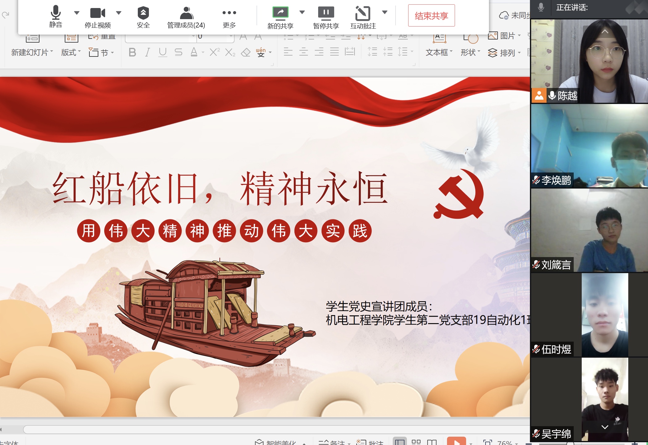 百年党史,波澜壮阔;百年大党,风华正茂。为了加强对青年大学生党史的学习教育,传承红色基因,校学生党史宣讲团成员、机电工程学院学生第二党支部预备党员陈越,分别在8月25日晚上7点和8月26日晚上分别给机电工程学院学生第二党支部和20自动化1班团支部开展了线上党史专题宣讲,主题为“红船依旧,精神永恒”。机电工程学院学生第二党支部书记史旭、学院学生第二党支部、20自动化1班团支部全体成员认真聆听了党课,并进行了交流。