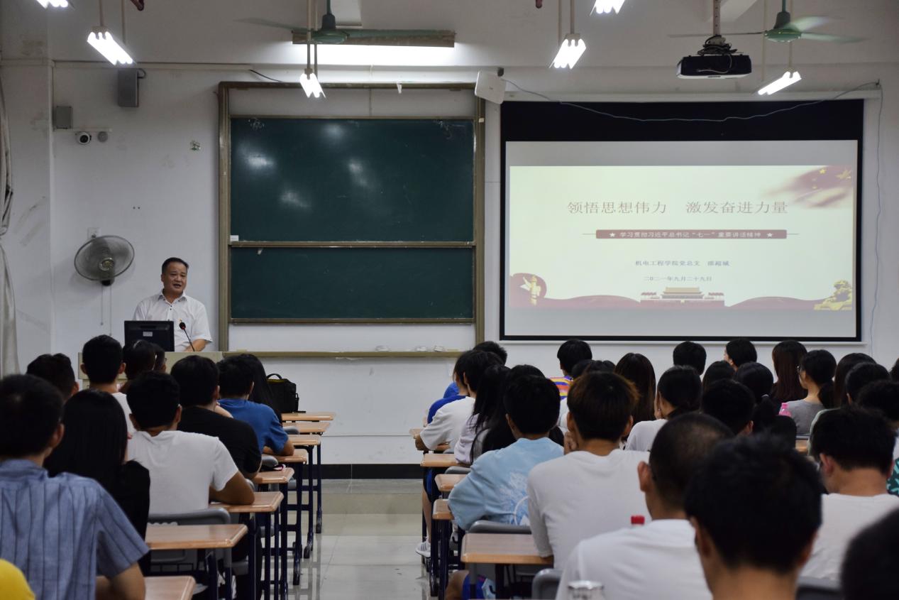 为全面贯彻落实习近平总书记在庆祝中国共产党成立100周年上的重要讲话精神,9月29日晚上7点,机电工程学院党总支书记邵超城在白云校区明德楼1—315为机电工程学院的125位入党积极分子讲授以“领悟思想伟力 激发奋进力量”为主题的思想政治理论第一课。机电工程学院辅导员徐瑞颖参与了此次学习。