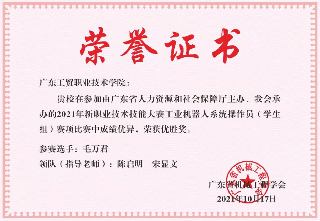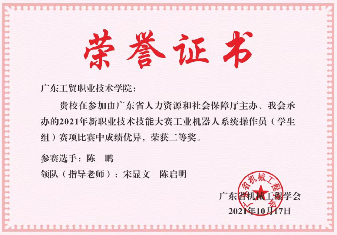 10月15-17日,由广东省人力资源和社会保障厅主办,广东省机械工程学会承办,深圳职业技术学院协办2021年新职业技术技能大赛“工业机器人系统操作员”赛项,来自全省24支参赛队伍,我院选手陈鹏、毛万君在该赛项中沉着应试、经过了两天激烈的角逐,顽强拼搏,分别获得了二等奖和优胜奖(指导教师:宋显文、陈启明)。