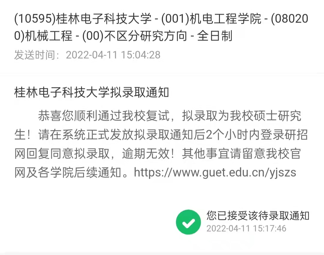 郑洪鑫在校期间表现优异,曾获得国家励志奖学金、学院三好学生、计算机二级证书(MS Offer)、英语六级等荣誉。他回顾以往升学历程,最感谢的是一直陪伴他、鼓励他的班主任老师,学工办主任严惠琴和制造与自动化系副主任邱腾雄。郑洪鑫2020年7月从工贸毕业,对他来说,人生轨迹的最大一次转变就在此刻,他深刻认识到社会的残酷和学历的重要性,在严惠琴的鼓励下,郑洪鑫下定决心报专升本考试。由于备考时间晚,每天拼命学习、废寝忘食,终于功不唐捐,同年10月,郑洪鑫重返校园,顺利考上本科。这时他却没有停止脚步,而是在自己心中种下希望的种子,希望两年以后继续读研。在两年的本科生活中,他一边严以律己学习文化课知识,一边为考研时刻打基础。同时,班主任邱腾雄一直望闻问切、不断为郑洪鑫提供学业与生活上的帮助。
