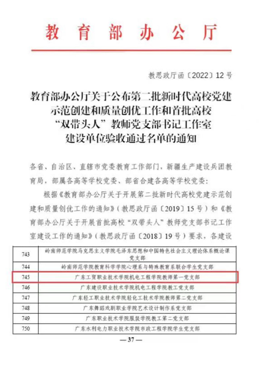 2022年6月7日,教育部思想政治工作司公布了第二批新时代高校党建示范创建和质量创优工作和首批高校“双带头人”教师党支部书记工作室建设单位验收结果,机电工程学院教师第一党支部顺利通过第二批“全国党建工作样板支部”建设单位验收。