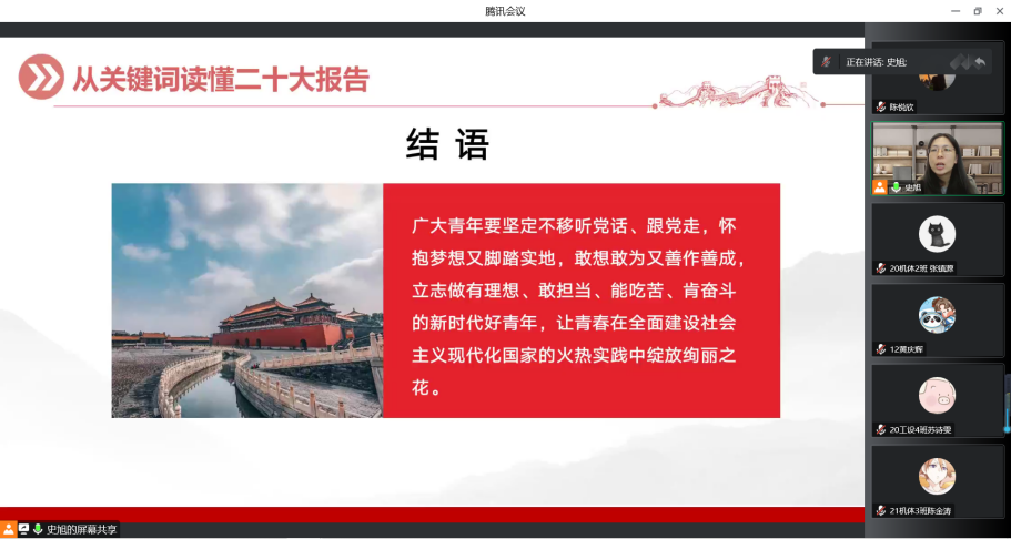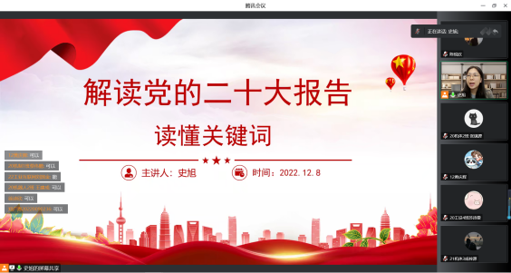 为深入学习贯彻党的二十大精神,2022年12月8日下午1点,机电工程学院在腾讯会议上召开了学习会议,本次会议由机电工程学院学生第二党支部书记史旭进行主持,机电工程学院学生第一、第二党支部学生党员及青年们参加本次学习会议。