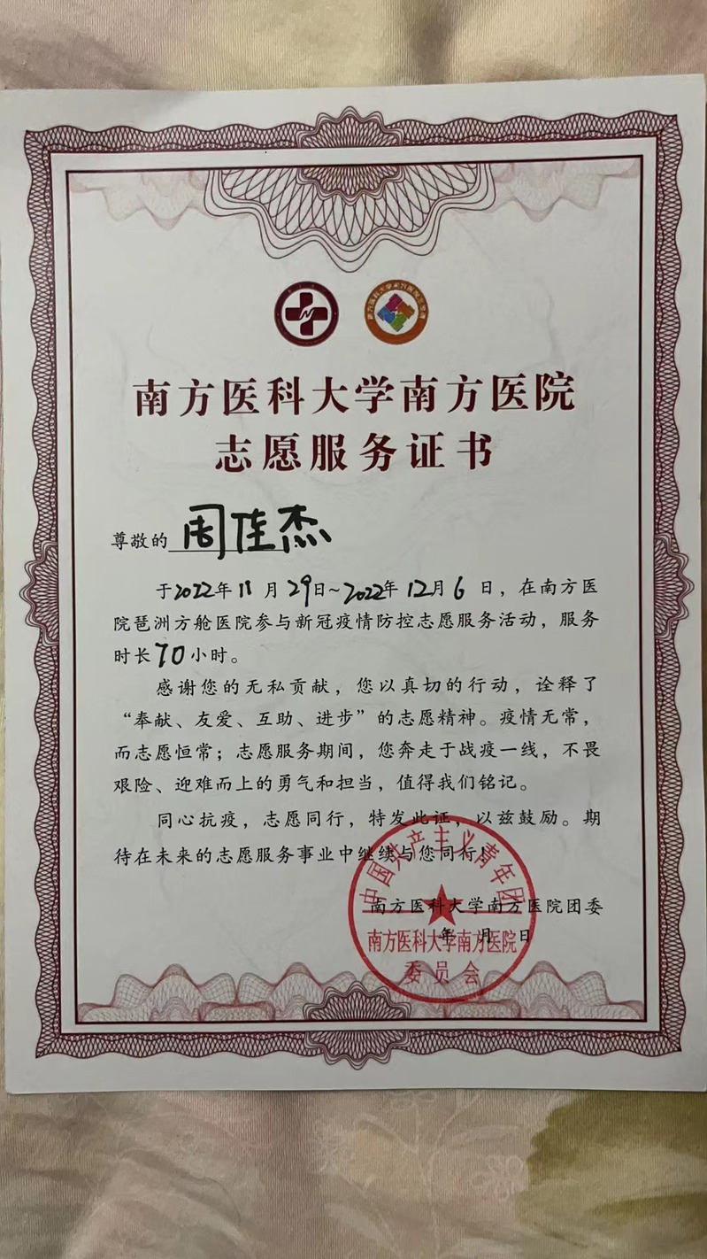 11月27日,周佳杰被通知确诊阳性,28日凌晨三点就被转运到琶洲的方舱医院,当晚持续发烧,混身肌肉酸痛。到方舱后,他看到患者很多,每个人都显得很无助,他所在这个舱,最少有400人,仅靠医护人员根本就忙不过来。早上8点多,周佳杰感觉身体好了一些后,立马去报名当志愿者。当时刚好到分发物资的时间,他马上加入工作队伍,为患者发放物资。经过一天的工作,他很快了解了工作流程,接下来的几天,便得心应手地开展他的志愿工作:每天早上五点发放早餐,之后通知各床准备测核酸,检测结束后就紧接着发放午餐,午饭后要给患者发放生活物资,下午五点接着发放晚餐,晚上除了要通知第二天需要出仓的患者收拾行李,还要见缝插针辅助医疗人员为患者建档登记相关信息、帮忙打扫卫生、排查存在的各种安全隐患等。除了服务患者、维持方舱秩序,周佳杰还会主动疏导焦虑患者的情绪,把自己乐观积极的心态传给其他舱友。方舱志愿者的工作琐碎且辛苦,但周佳杰丝毫没有任何犹豫,竭尽所能地用尽自己绵薄之力为医护人员保驾护航。