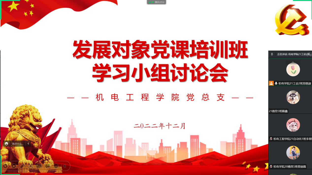 为加深发展对象党课培训班学员对党的认识和加强学员间的思想交流,机电学院党总支部于2022年12月11日早上08:30在腾讯会议上开展发展对象党课培训班学习小组讨论会,出席本次会议的有机电工程学院学生第二党支部书记史旭老师、机电工程学院学生党支部该期全体发展对象,本次会议由学员郑慈淑主持。