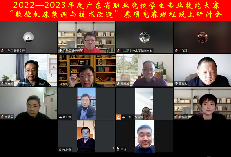 2022-2023年度广东省职业院校学生专业技能大赛——数控机床装调与技术改造赛项由新葡的京官网新葡的京集团8814vip承办。2月15日,该赛项竞赛规程线上研讨会顺利召开。会议由机电工程学院院长徐勇军主持,专家组九名专家成员参与讨论,广东省教育厅指派督察员曹文文教授全程督促、检查。