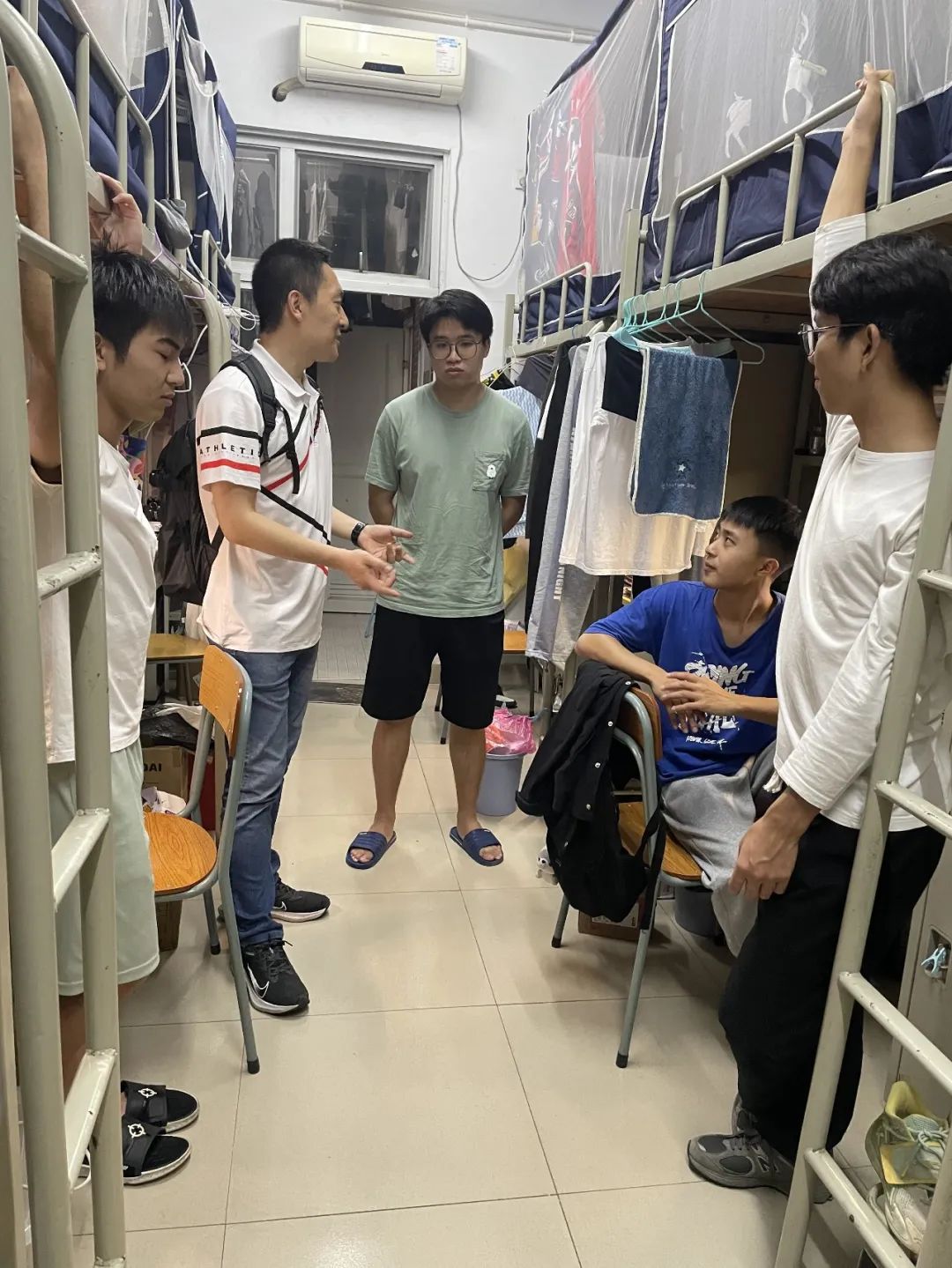 曾锋老师利用值班时间走访6栋302、301学生宿舍,关心同学们日常生活,和同学们谈论有关升学与就业问题,指引学生做好毕业去向规划。