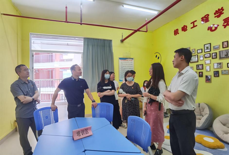 梁超鹏介绍与会人员,对陈维泽一行的到来表示热烈欢迎,双方围绕学生思想政治工作开展情况进行深入交流。梁超鹏就学校基本情况与机电学院思想政治工作建设情况作主题发言,并从“十大”育人矩阵建设思路、“一体系”构建“三全育人”新格局、“两平台”打造网络思想主阵地、“三工作室”全面提升学工职业素养、建立档案总结经验五个方面分享学生思想政治教育工作经验;辅导员邵盼盼就班主任、辅导员工作室建设情况作主题发言,表示工作室全面贯彻党的教育方针,结合学院工科专业和人才培养实际,注重育人实效,用人文情怀陪伴学生健康成长;辅导员惠梦梦以心理辅导站为基地,立足教育、重在预防——为学生心理健康保驾护航为主题进行发言,表示辅导员在进行大学生心理健康教育的同时要多关注个性化个体的思想状况和心理健康,加强工作纪律,尊重、保护学生隐私,为学生心理健康保驾护航。随后,陈维泽一行现场参观我院辅导员、班主任工作室及二级心理辅导站,就两个工作室建设方面进一步深入探讨。