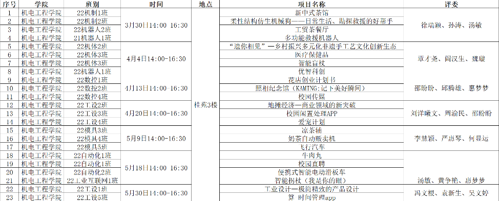 为全面落实习近平总书记给中国国际“互联网+”大学生创 新创业大赛“青年红色筑梦之旅”大学生回信重要精神,深入推进大众创业万众创新,推动高等教育高质量发展,加快培养创新创业人才,持续做好新葡的京官网 2023 年创新创业大赛准备工作,遵照 “及早行动、系统组织”原则,机电学院于 2023 年 4 月 6 日-6月 15 日举办新葡的京集团8814vip第九届中国国际“互联网+”大学生创新创业大赛校内选拔赛,并组织了十余名专任教师和辅导员担任评委。