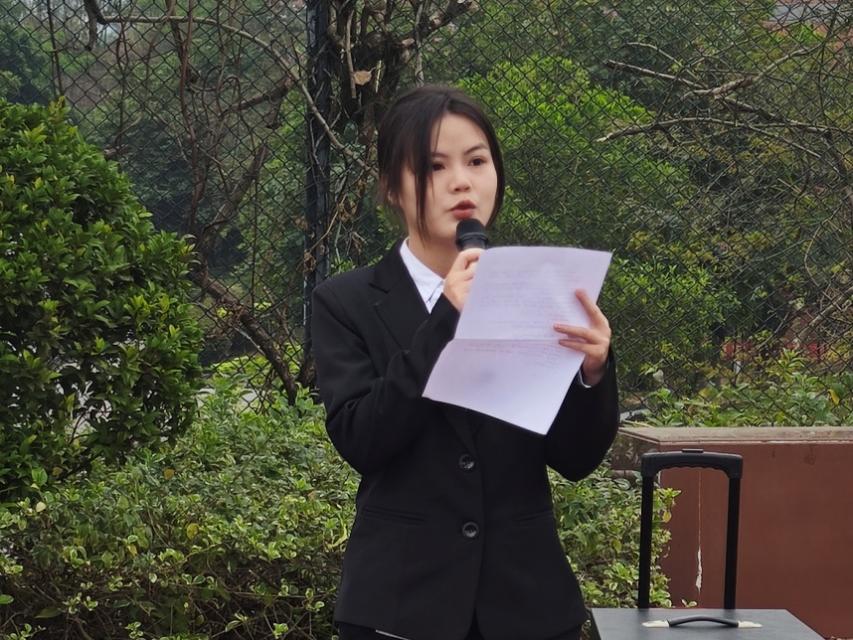 早上七点四十五分,升旗仪式正式开始,国旗护卫队整装待发,在他们眼里,目光所致皆是国旗,心之所向皆是荣光。主持人话音刚落,护卫队队员们迈着整齐的步伐,有力的动作护送国旗进场。伴随着庄严的《义勇军进行曲》,鲜艳的五星红旗在朝阳的映照下,缓缓升起,迎风飘扬。那一刻,同学们的目光聚焦在这面旗帜上,心中充满了敬意和自豪。随后,陈晨同学作为学生代表,在国旗下以“强国有我,青春有为”为主题进行发言,他认为当代大学生要将强国理念融入自我,正如一代人有一代人的使命担当,在激扬青春、开拓人生、奉献社会的进程中书写无愧于时代的壮丽篇章。
