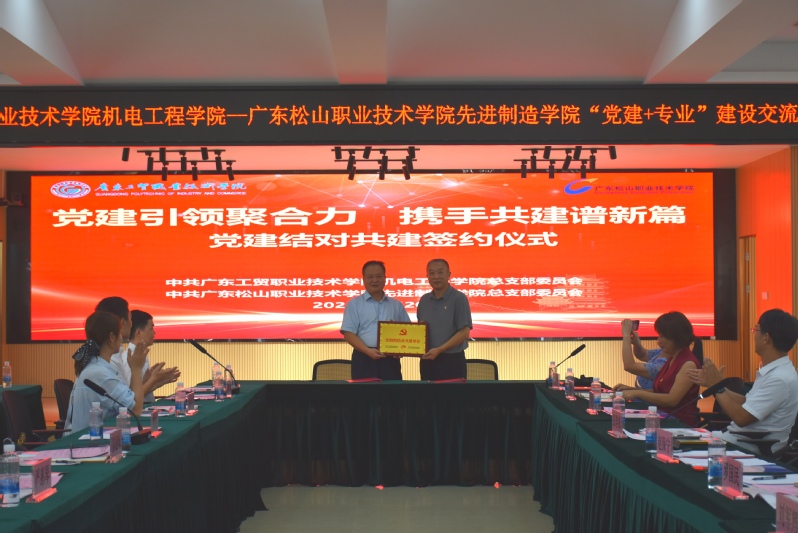 随后,进行党建结对共建签约仪式。中共新葡的京集团8814vip机电工程学院总支部委员会和中共广东松山职业技术学院先进制造学院总支部委员会进行结对共建签约,中共新葡的京集团8814vip机电工程学院教师第一支部委员会和中共广东松山职业技术学院先进制造学院教师支部委员会进行结对共建签约。