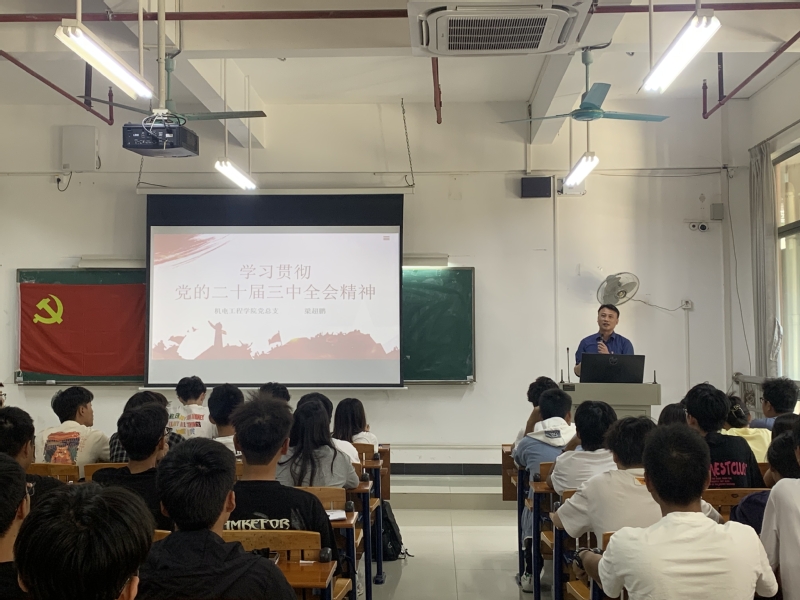 为做好2024年秋季学期二级学院党总支书记院长上第一堂思政课工作,落实学校党的二十届三中全会精神“六队百人”宣讲行动实施方案,10月31日下午16时,机电工程学院党总支书记梁超鹏在白云校区明德楼2-203教室,为第43期入党积极分子培训班学员讲授“学习贯彻党的二十届三中全会精神”专题党课,本次党课由机电工程学院组织员李慧颖主持。