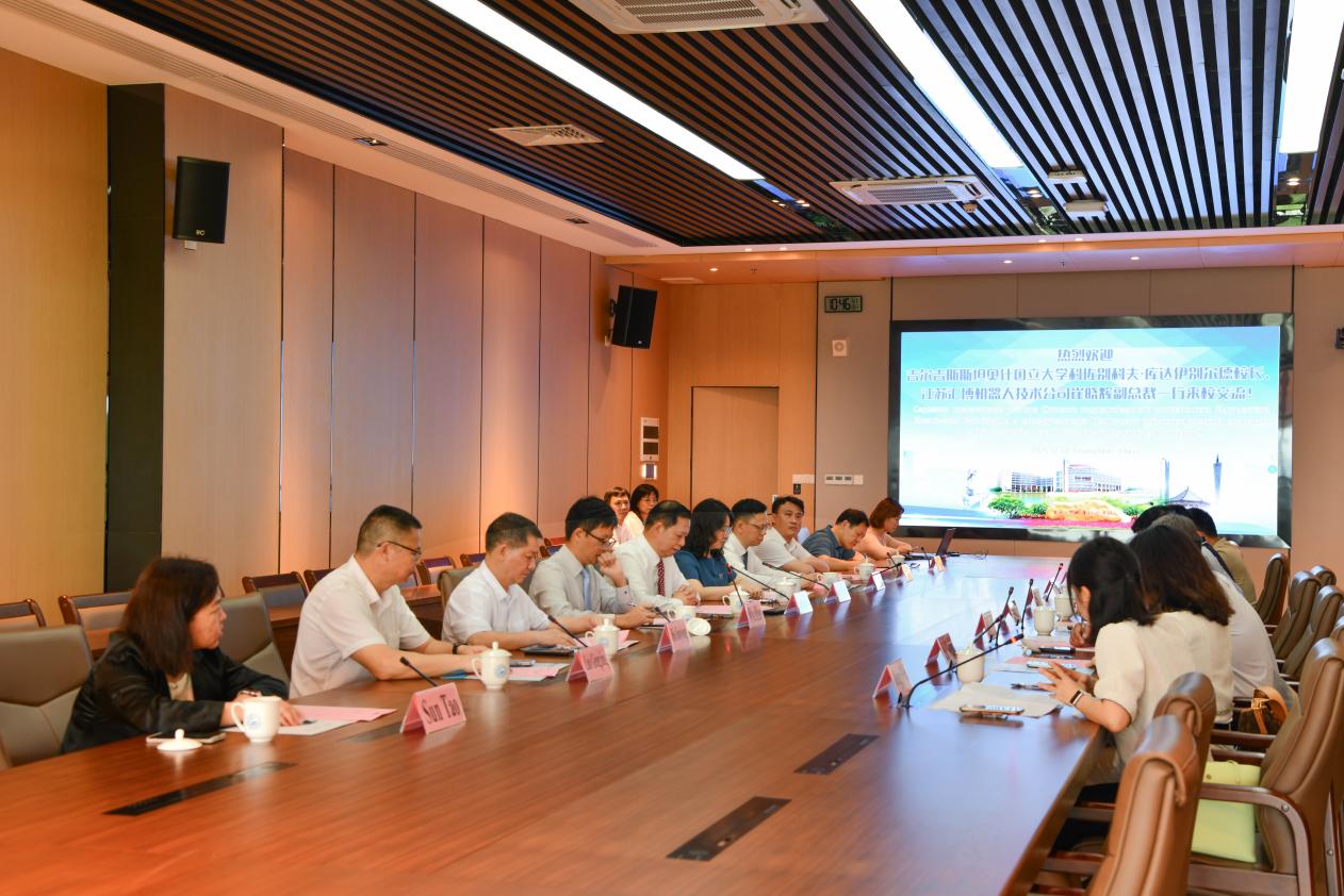 参观结束后,在博学楼628会议室举行了交流会。会上,何汉武致辞,强调了学校“开放办学、服务社会”的理念,介绍了学校开展国际合作办学的经验和典型做法,表达了不断深化国际合作办学、校企融合的期望。Kozhobekov Kudaiberdi介绍了该校的办学特色及合作愿景,表达了开展人才培养、科研技术协作的意愿。崔晓辉分享了该公司在工业机器人领域的技术优势,表达了校企共建实训基地、共同开展高素质人才培养的期待。