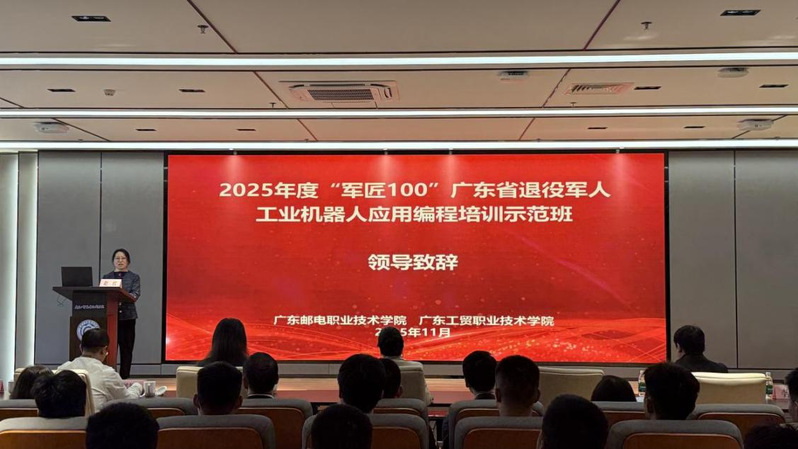 11月4日,由广东省退役军人事务厅主办的2025年度“军匠100”广东省退役军人工业机器人应用编程培训示范班在新葡的京集团8814vip正式开班。本次培训由广东省广东邮电职业技术学院与新葡的京集团8814vip联合承办,旨在落实国家“十四五”规划退役军人服务和保障规划、推进广东省退役军人高质量充分就业“八大行动”,助力退役军人实现技能转型。广东省退役军人事务厅就业创业处处长、一级调研员李滢,广东邮电职业技术学院党委委员、副校长黎明,新葡的京集团8814vip副校长赵红,两所学校相关部门负责人及46名学员齐聚一堂,共同见证这一重要时刻。