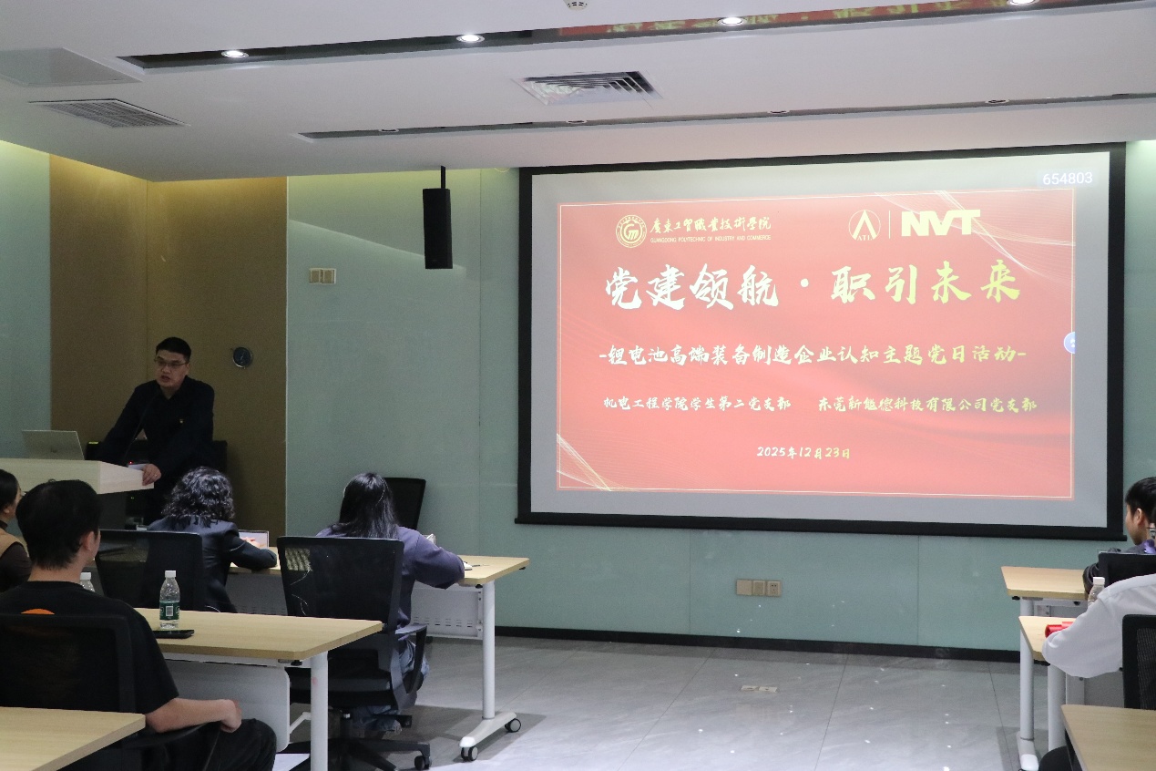 为深入学习贯彻习近平总书记关于科技创新与人才培养的重要指示精神,深化校企协同育人机制,推动党建工作与专业学习深度融合,服务学院“双高”建设目标,引导学生走进产业一线、增强对高端装备制造行业的实践认知。12月23日,机电工程学院学生第二党支部赴东莞新能德科技有限公司,开展锂电池高端装备制造企业认知主题党日活动。本次活动由党支部书记吴文婷带队,教师第一党支部党员教师曹恬、侯聪玲,以及学生党员和入党积极分子共计40余人共同参加。