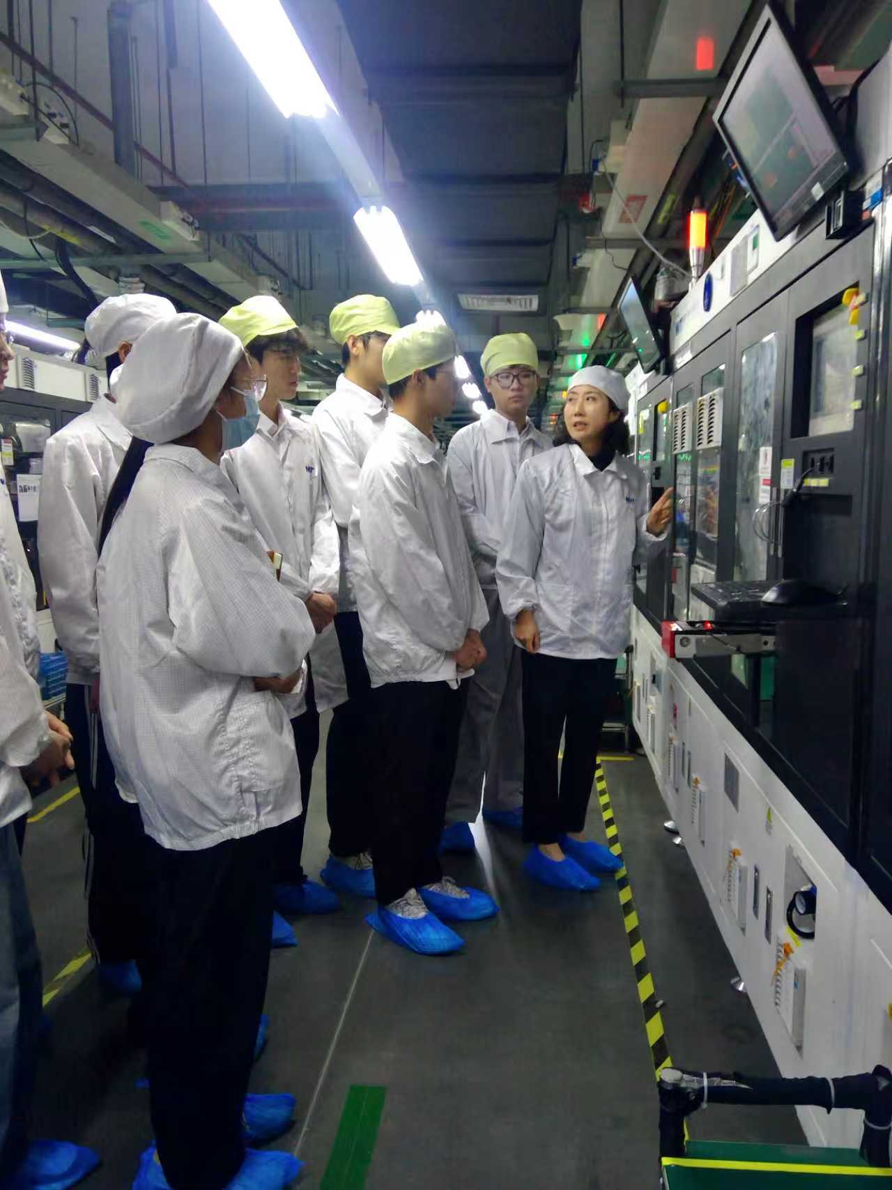随后,师生严格遵守安全规范,走进锂电池智能化生产车间进行实地参观。车间内自动化产线高速运转,机械臂精准完成上下料、焊接等作业,智能管控系统大屏实时跳动着各项生产数据。从电芯组装、焊接、检测到封装,工作人员耐心讲解每一道工序的技术要点与装备原理。同学们既深刻感受到智能制造的魅力,也对“专业所学即所用”有了更真切的体会。