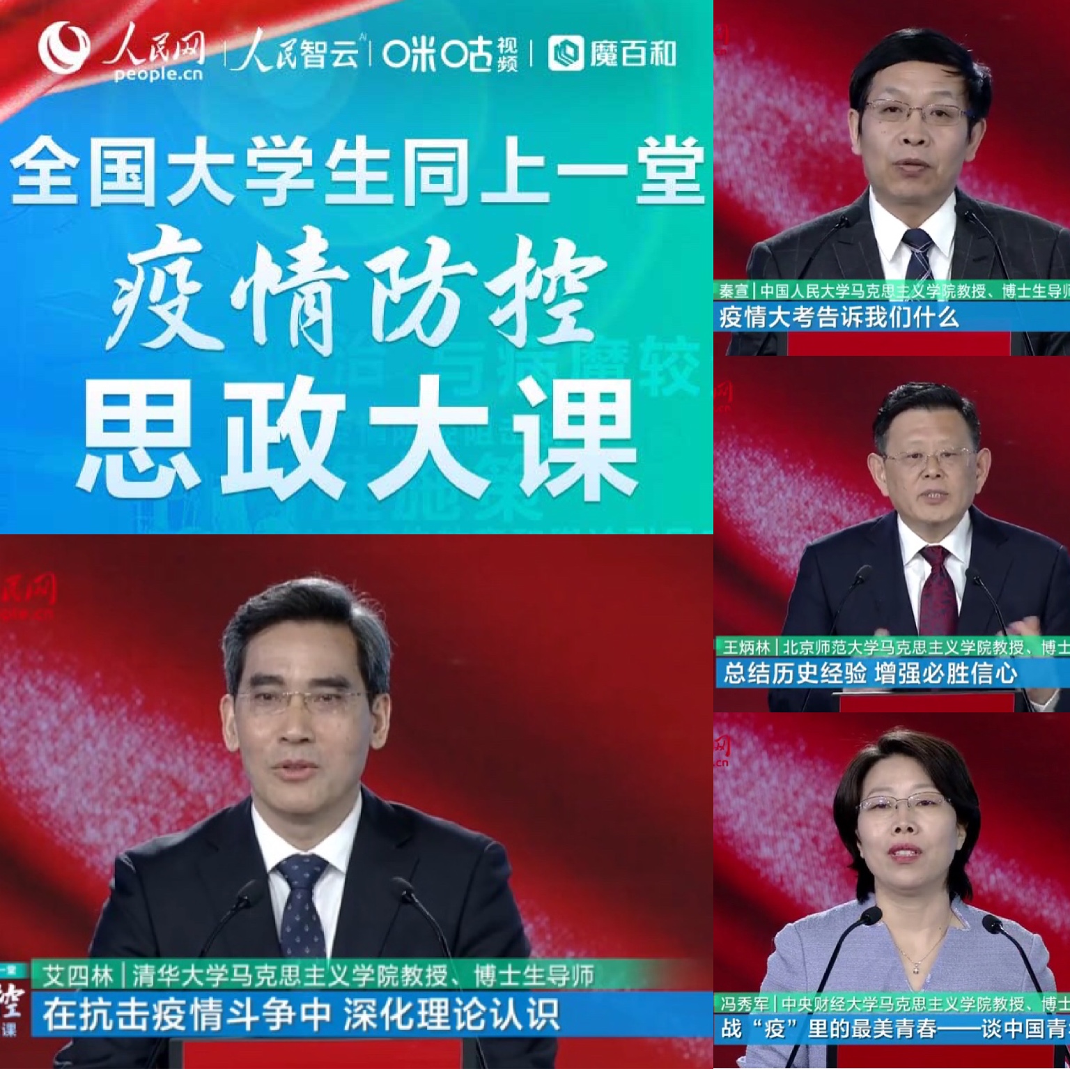 本次授课特别邀请了清华大学艾四林、中国人民大学秦宣、北京师范大学王炳林、中央财经大学冯秀军四位教授,在将近两个小时的直播中,四位教授娓娓道来,全面解读了以习近平同志为核心的党中央关于疫情防控的决策部署,分析了中国在抗击疫情形势下彰显的中国共产党领导和中国特色社会主义制度的优越性,讲述了防疫战疫一线涌现出的许多感人故事,从奋战一线的医务工作者到保家卫国的人民子弟兵,从负重前行的公安民警到扎根基层的普通干部,从默默奉献的志愿者到日夜穿行的快递小哥……举国上下众志成城,创造了震撼的中国速度和动人的中国力量。四位专家的讲授既有思想的高度,又有理论的深度,还有情感的温度,将丰富的理论知识和疫情防控中的责任担当结合起来,引发了师生们的强烈共鸣。