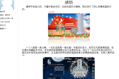 祭扫前,概论党小组制定详细活动方案,全体党员教师,包括外聘教师首先通过优慕教学平台发出通知和倡议,然后要求同学们在中华英烈网通过“为英烈鲜花”、“学习英烈事迹”和“烈士陵园祭扫”三个环节寄托哀思,缅怀先烈,并将所思所感所悟通过优慕平台进行交流。