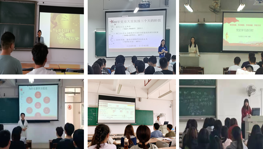 在马院直属党支部的统一安排下,各任课老师以教研室(党小组)为单位进行了集体备课,将党史教育分别融入到《思想道德修养与法律基础》、《毛泽东思想和中国特色社会主义理论体系概论》、《马克思主义中国化进程与青年使命担当》等课程,做到了全体马院教师和任课班级的全覆盖,宣讲内容有《百年风雨兼程 百年沧桑巨变—-百年党史:共产党人砥砺前行的动力与丰富生动的教科书》、《红船精神:开天辟地》、《毛泽东诗词中的党史》、《从万里长征到星辰大海》、《新中国70年奋斗与辉煌》、《改革开放:中国共产党的一次伟大觉醒》、《中国共产党领导脱贫攻坚的经验与启示》、《新时代中国共产党人的历史使命》、《观百年党史 悟初心使命》等,精彩纷呈,生动再现了中国共产党披荆斩棘、砥砺前行的百年风雨奋斗历程。