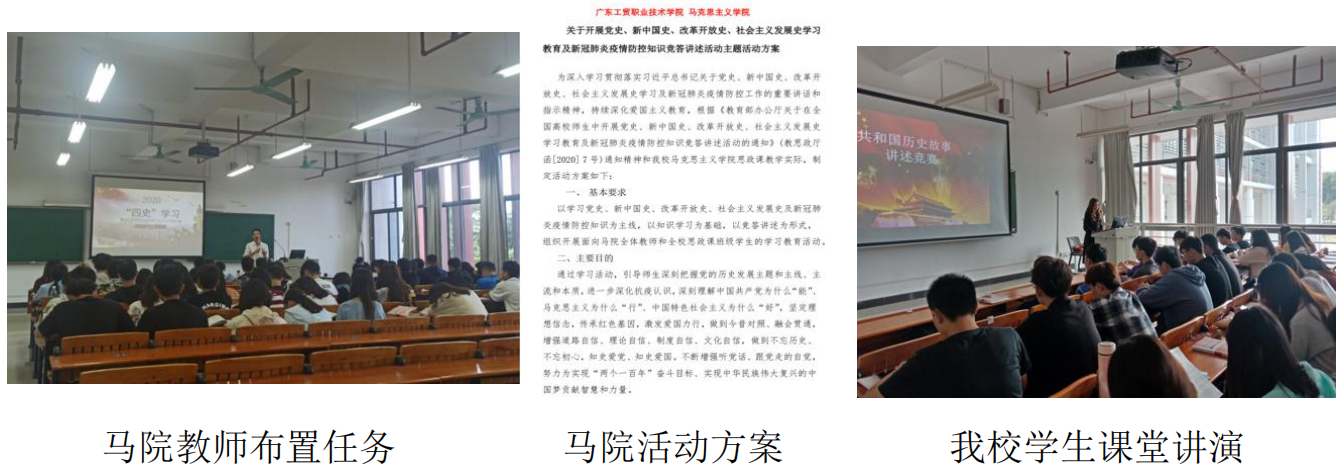 为深入学习贯彻落实习近平总书记关于党史、新中国史、改革开放史、社会主义发展史学习及新冠肺炎疫情防控工作的重要讲话和指示精神,根据教育部办公厅关于在全国高校师生中开展“四史”学习教育及新冠肺炎疫情防控知识竞答讲述活动的通知精神和省教育厅的部署安排,结合新葡的京官网党委的工作要求和思想政治理论课教学实际,马克思主义学院在上个学期开学初制定了《关于开展党史、新中国史、改革开放史、社会主义发展史学习教育及新冠肺炎疫情防控知识竞答讲述活动主题活动方案》,马院教师积极响应方案要求,在班级中组织学生开展相关讲演活动。