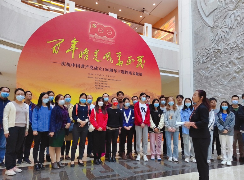 为扎实推进党史学习教育、持续学习贯彻习近平总书记“七一”重要讲话精神,教育和引导广大师生了解党的光辉历史和光荣伟绩,读懂百年大党的胜利密码,感受烈火淬金的精神锋芒,根据省委教育工委工作部署和学校党委要求,马克思主义学院直属党支部于11月9日下午组织党员教师和学生赴广东省档案馆参观“百年恰是风华正茂”主题档案文献展活动。