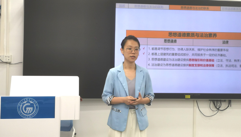本次比赛包括讲课和答辩两部分,选手出场顺序由现场抽签决定,每位选手讲课时间为20分钟,答辩时间为5分钟,并由评委现场提问。比赛现场五位青年教师专业基础理论较扎实,较好地运用雨课堂、课堂派等信息化教学手段开展混合式教学,能够比较准确把握教学重点、难点、围绕教学核心思想进行教学展示。方瑜聪老师主讲《不断提升思想道德素质与法治素养》,张倩倩老师主讲《构建人类命运共同体》,李静老师主讲《习近平新时代中国特色社会主义思想的历史地位》,刘文林老师主讲《新民主主义革命理论的形成依据》,郭丹老师主讲《坚持走和平发展道路》。