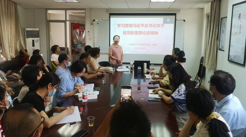 首先,马院直属党支部临时负责人宁晓菊教授讲党课《学习贯彻习近平总书记关于教育的重要论述精神》。她从战略视野、内容体系、重大意义三个方面对习近平总书记关于教育的重要论述精神进行了领悟分析,提出要始终站在“百年未有之大变局”的世界视野下看教育,始终联系“中华民族伟大复兴”的战略全局看教育,始终抓住教育的根本问题来思考教育。习近平总书记关于教育的重要论述是一个随着教育改革发展不断丰富完善的开放体系,需要我们在学习中持续追踪、动态更新,不断加深认识。