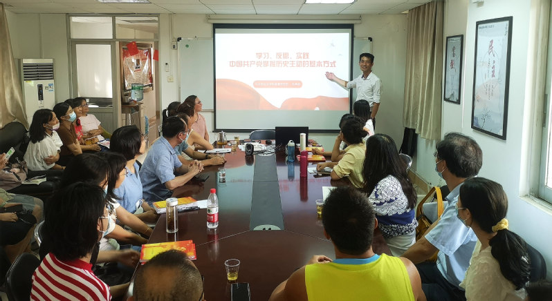 随后,马院党史教研室主任赵勇敢老师讲党课《中国共产党掌握历史主动的基本方式》。赵老师的党课内容选自《习近平谈治国理政》第四卷第一专题,重点介绍“掌握历史主动”这一全书鲜活的题眼。他从历史主动、理论自觉、不忘初心三个角度阐述了中国共产党掌握历史主动权的基本方式,并结合思政课教学实践指出了化被动为主动,主动学习,主动反思,主动实践的重要意义,引导思政课教师党员更准确地把握和践行中国共产党历史主动精神。