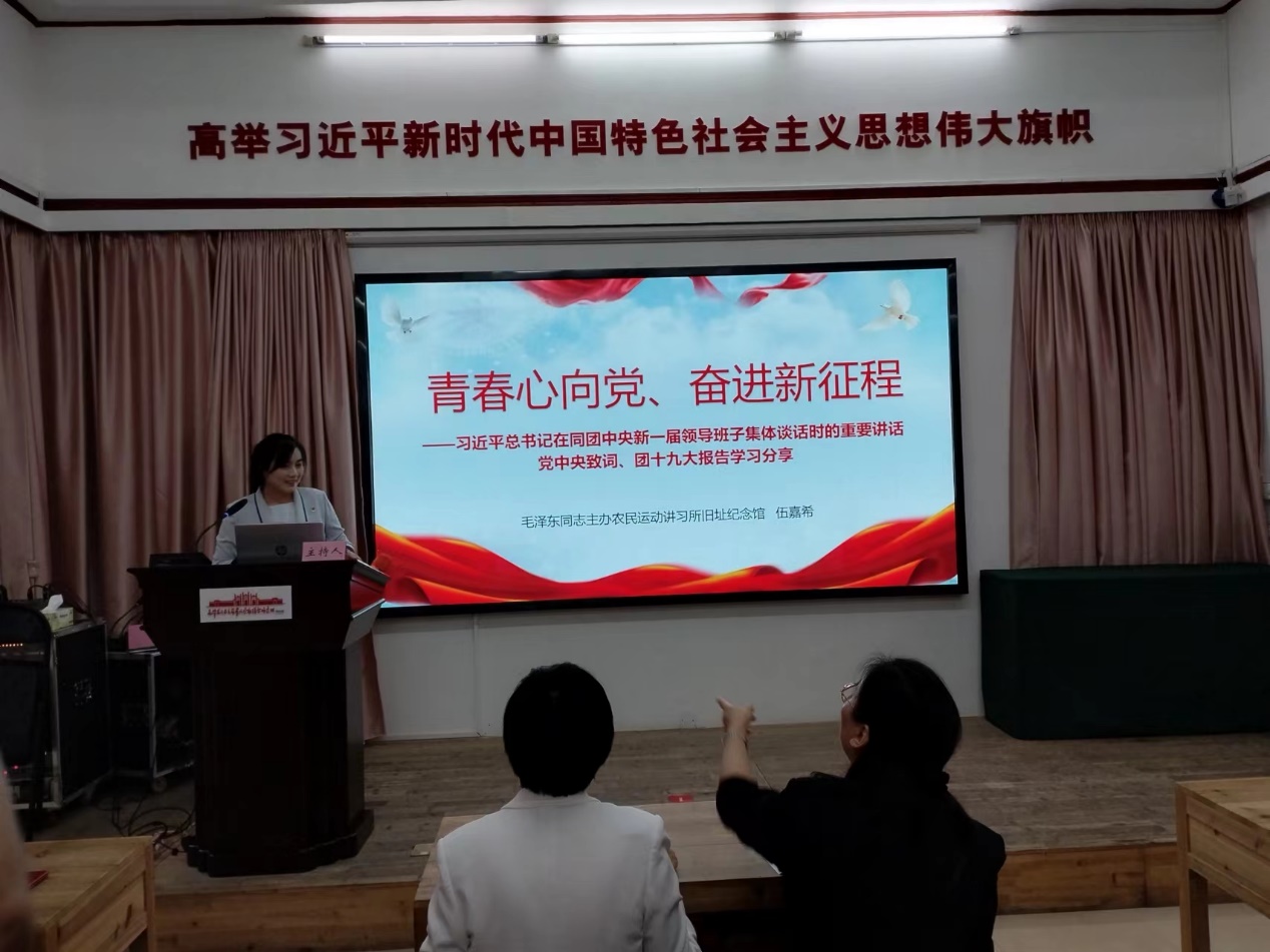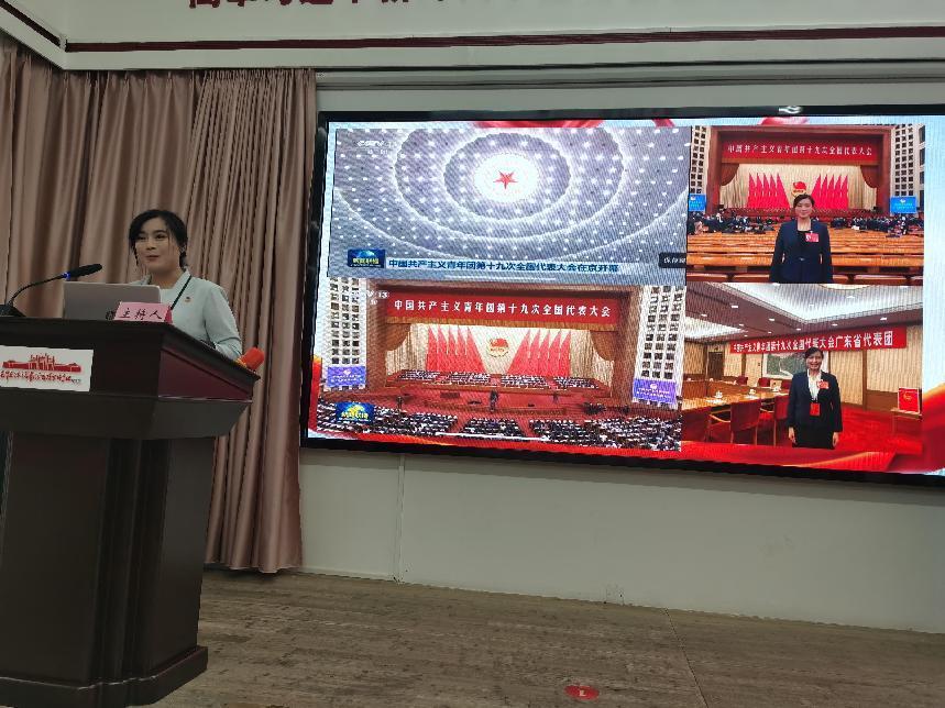 课上,伍嘉希从自身参加共青团全国十九大的心得谈起,系统讲述了自己对习近平总书记在同团中央新一届领导班子集体谈话时的重要讲话、党中央致词、团十九大报告等方面内容的学习体悟。之后结合五年多来讲解员工作中碰到的感人事件分享了广州农民运动讲习所第一任主任澎湃、市交通运输局离退休第一党支部党员贾献图等人的感人事迹和爱国情怀。她讲到,“青年强则国强,青年之强,首先应强在信仰上、思想上、精神上,青年一代的理想信念、精神素养,是一个政党薪火传承的重要基础,是一个国家发展活力的重要体现。”“党的百年奋斗历程告诉我们,中国青年和中国青年运动,从来都是在担当时代使命中彰显青春的使命”。她勉励工贸学子要牢记总书记嘱托,跟随伟大时代的主旋律,用青春的能动力和创造力激荡起民族复兴的澎湃春潮,在不懈奋斗中绽放绚丽的青春之花、书写壮丽的青春华章。