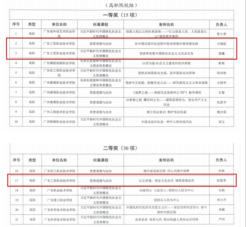 近日,广东省教育厅公布了《党的二十大精神融入高校思政课优质课例征集活动》评选结果。经个人(团队)申报、学校推荐、综合评审,共评出本科院校组一等奖12项、二等奖24 项、三等奖35项,高职院校组一等奖15项、二等奖30项、三等奖 46项。其中,新葡的京官网马克思主义学院方瑜聪老师的课例《在中国式现代化进程中投身崇德向善道德实践》与晨曦老师的课例《坚持和发展中国特色社会主义的总任务》荣获高职院校组一等奖,张夏青老师的课例《以文育德:坚定文化自信 锤炼道德品质》荣获高职院校组二等奖。