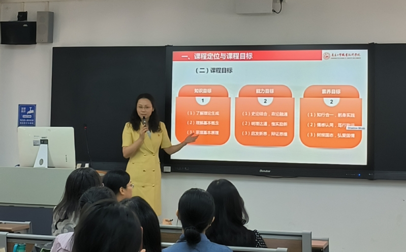 在比赛中,参赛教师分别从课程设置依据、课程目标、教学设计、教学资源、课程教学团队和课程应用与特色六个方面展开说课,紧扣人才培养目标和思政课立德树人目标,并依据课程特点,结合独特的教法、学法、教学过程等环节精彩展示说课程内容。教师们从容自信的姿态、条理清晰的语言,充分体现了马院教师扎实的教学基本功和良好的专业素养。