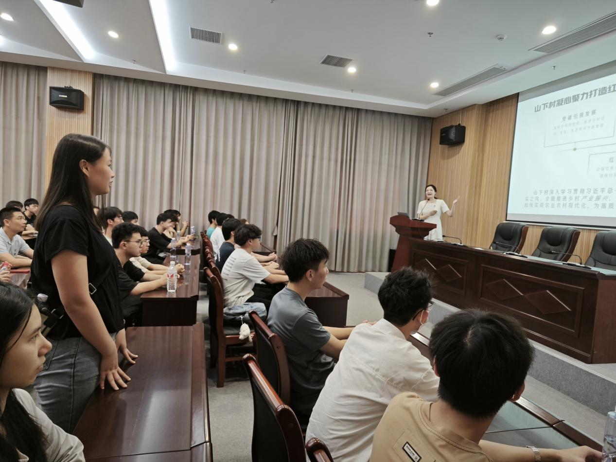 张倩倩老师围绕乡村振兴战略背景、乡村振兴三步走目标、乡村五大振兴、振兴乡村不负青春四个方面为在场师生展开实践教学。她首先和听课师生们一起学习了习近平总书记关于全面推进乡村振兴是新时代建设农业强国的重要指示精神,随后结合现场教学所在地——龙门山下村的发展带领大家领悟精神、落实行动。近年来山下村以深入实施“百县千镇万村高质量发展工程”为契机,立足自身红色资源禀赋以及优越的生态优势,致力打造一条“红+绿”旅游路线,为乡村振兴注入新动力。同时,山下村作为“红色村”的典型模范,始终深入学习习近平总书记关于“三农”工作的重要论述,贯彻落实党的二十大精神,大兴落实之风,全面推进乡村产业振兴、人才振兴、文化振兴、生态振兴和组织振兴,加快实现农业农村现代化,为高质量发展奠定坚实基础。