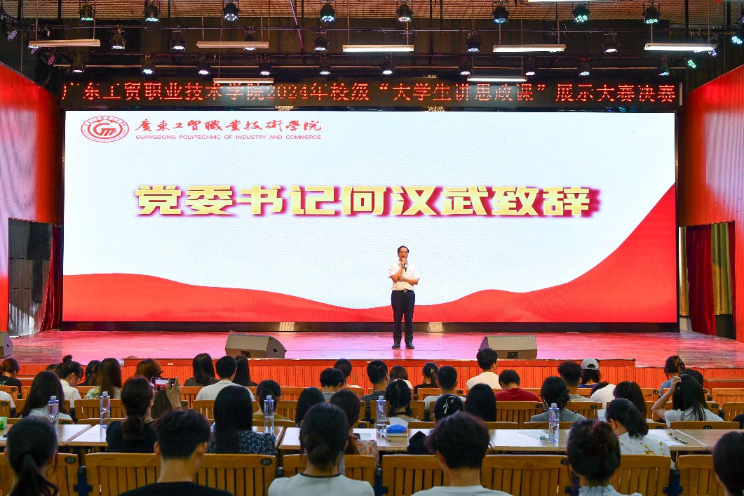 何汉武现场发表了热情洋溢的讲话。首先,他祝贺比赛活动取得圆满成功,为本次活动的组织者和参赛学生的精彩表现点赞。他指出,本次活动是在学校党委高度重视下,由马克思主义学院作为牵头单位,学校各个部门团结协同、精心组织筹办的。20组作品情感真挚、案例生动、分析深入,充分展示了工贸青年学生追求卓越、精益求精、勇于实践的精神风貌,肯定了同学们充分调研并挖掘发生在我们身边的动人故事的实践精神。
