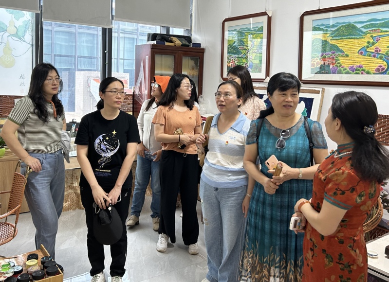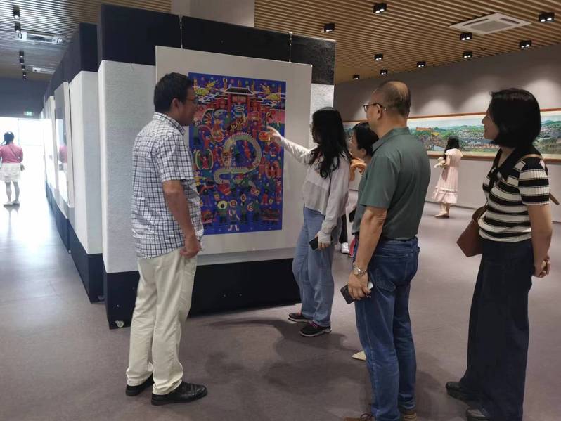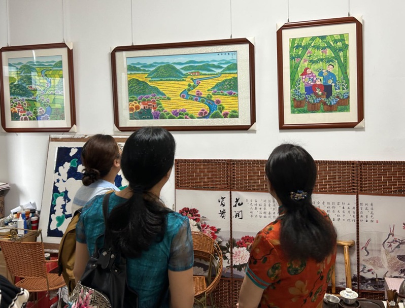 随后,一行人来到龙门县文化馆,实地感受龙门县历史文化底蕴和人文发展成就。马院教师重点参观了龙门农民画展厅与农民画画室。龙门农民画起源于清末,是广东省的传统民俗绘画艺术,被誉为“岭南艺术奇葩”,它继承了传统的民间艺术形式,以岭南民俗为特色,用色彩明艳的画风描绘乡土气息的风情、民间习俗。党员们现场欣赏着一幅幅色彩鲜艳、生机蓬勃、富有视觉冲击力的农民画精品,倾听着优秀农民画艺术家骆雪芳女士讲解的龙门农民画的历史、特色和构图,感受着农民画创作者们自由奔放的心灵创作、浓郁的乡土风情以及独特的艺术魅力和审美情趣,了解画纸上的匠人、了解非遗,弘扬中华优秀传统文化,增强实现中华民族伟大复兴的精神力量。