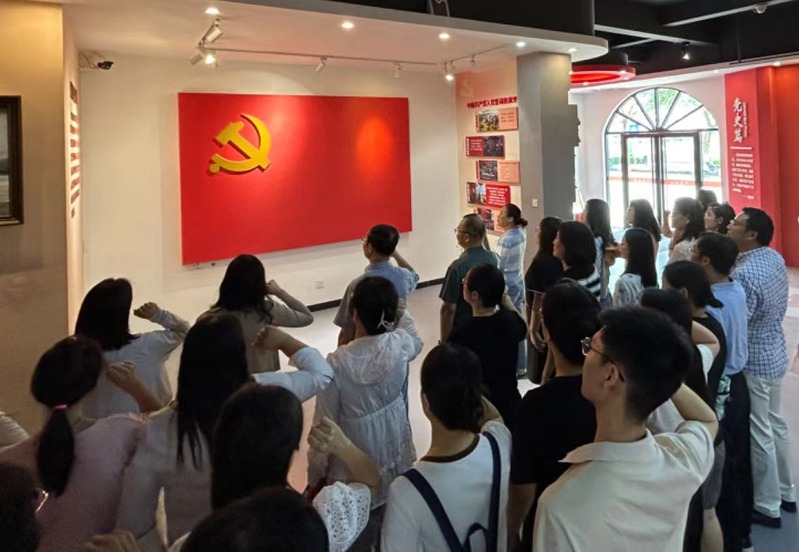 活动第一站来到龙门县政治生活馆参观学习,馆内设党史厅、党建厅、党教厅、党誓厅以及政治生活厅等五个功能厅,提供涵盖“红色传承教育、美丽党建示范、互动学习教育、党员咨询服务、党务知识竞赛、规范组织生活”等多位一体的政治教育服务。马院教师边观看文献资料和历史图片边聆听讲解,进一步了解了龙门县的党建事迹,深刻领略了中国共产党艰苦奋斗的不屈精神。馆内展示的优秀共产党员事迹与违法违纪案例的典型,时刻警醒党员干部筑牢思想堤坝,坚守廉洁底线,对于思政课教师党员而言这是一次深刻的党性教育和精神洗礼。参观结束前,在支部临时负责人宁晓菊的领誓下,全体党员佩戴党徽,高举右拳,面向鲜红的党旗重温入党誓词,更加坚定对党忠诚、为党的事业奋斗终身的信心和信念。