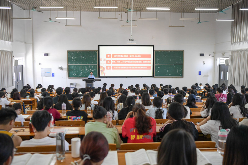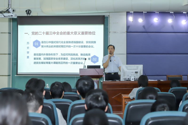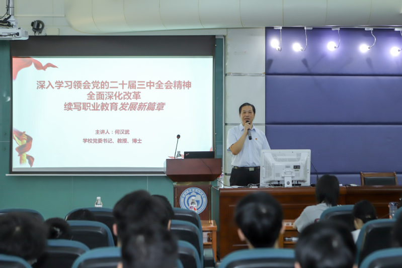 授课伊始,何汉武以今年中华人民共和国将迎来75周年华诞开场。基于对党的二十届三中全会召开的历史背景、会议内容的总体介绍,深刻阐释了党的二十届三中全会的重大意义、重要地位。他系统解读了党的二十届三中全会的主要内容、核心要义、全会主题与主题确立的依据。何汉武强调,学校已组建“六队百人”宣讲团,广大师生要将学习党的二十届三中全会精神作为当前和今后一个时期全党全国的一项重大政治任务学,对照《决定》《公报》《工作报告》《说明》和习近平总书记重要讲话整体学、系统学,结合自身学习工作和学校高质量发展中心工作学,以新时代教育评价改革、科研体制改革、人才发展体制机制改革为牵引,以钉钉子精神不断推动学校高质量发展,为学校“新双高”建设、“十五五”职教本科大学建设注入强劲动力。